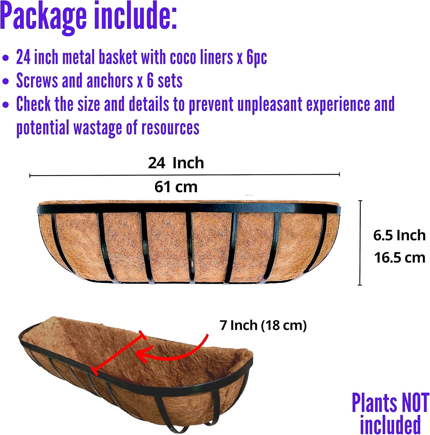 LaLaGreen Deck Railing Planter Boxes for Plants (24 Inch, 6 Pack) Metal Wall Planters for Outdoor Plants, Black Window Flower Boxes Deck Railings with Coco Liner Fence Balcony Patio Porch Over Rail