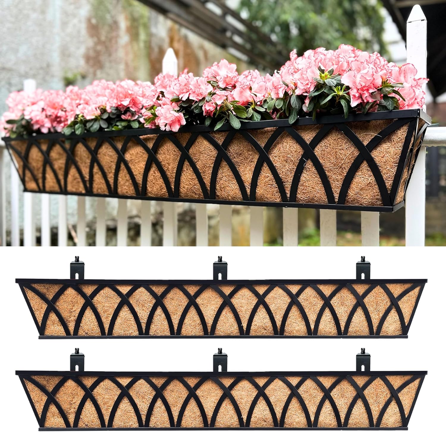 - MATERIAL FROM COCONUT: These flower boxes for deck railings are filled with coco coir liners, which are excellent planting material for plants. They hold a significant amount of water while providing superior drainage and good air ventilation for the roots. Coir is a natural fiber extracted from coconut husks, making it a great choice for your garden.
