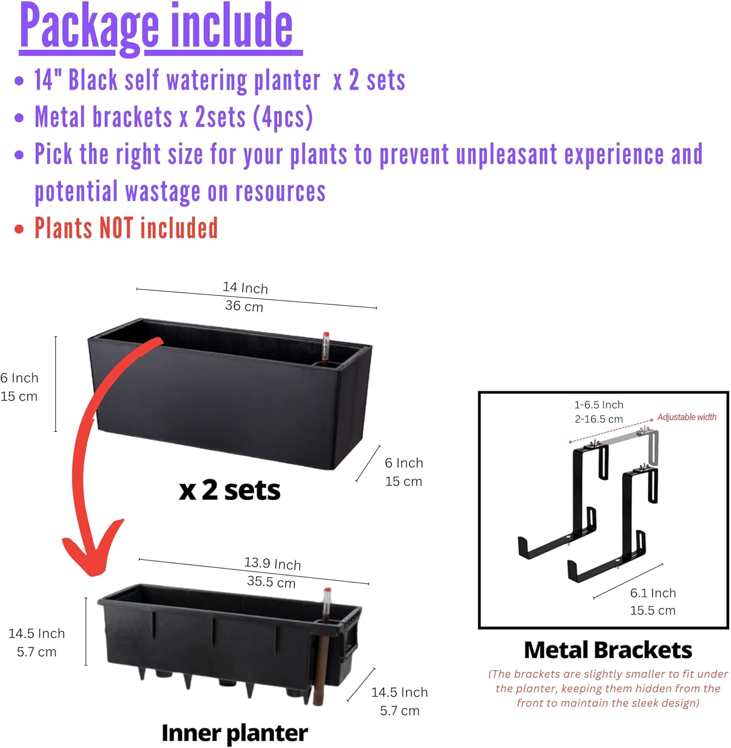 - 2 PACK SET: 14 inch, black flower boxes for railings. Pick the right size for your plant to prevent unpleasant experience and potential wastage on resources. Flowers and Plants are NOT included. Easy to use, no special assembly is required.