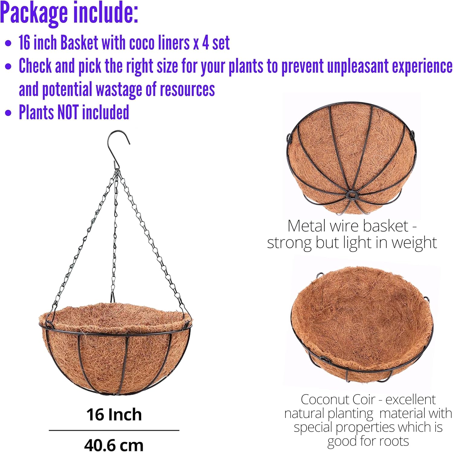 - 4-PACK SET: 16 inch, extra large baskets. Pick the right size for your plants to prevent unpleasant experience and potential wastage on resources. Flowers and Plants are NOT included. These metal wire hanging flower pots are ready to hang with coco liners, metal hanging chain and hook. Assembly not required