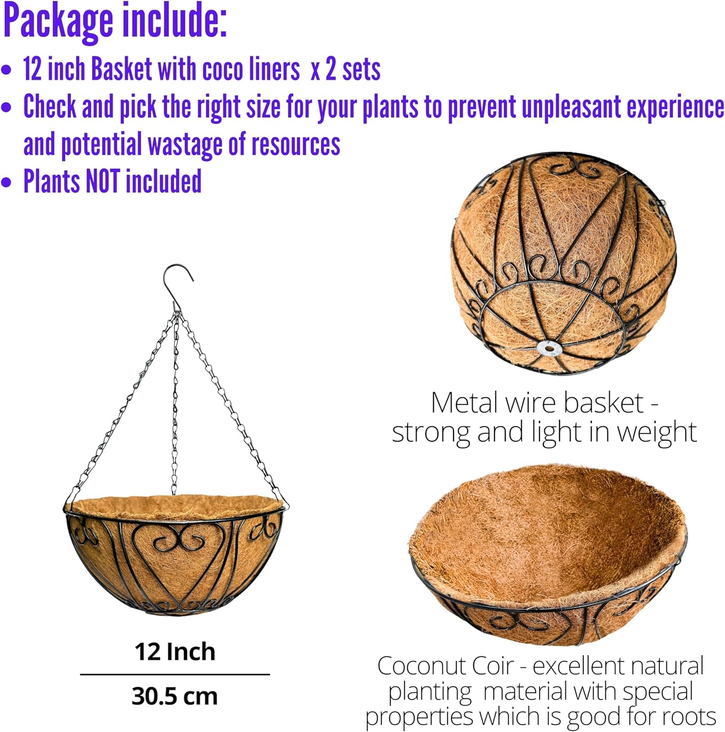 - 2-PACK SET: 12 inch, medium size. Pick the right size for your plants to prevent unpleasant experience and potential wastage on resources. Flowers and Plants are NOT included. These 10 in hanging baskets for plants are ready to hang with coco liners, metal hanging chain and hook. Assembly not required