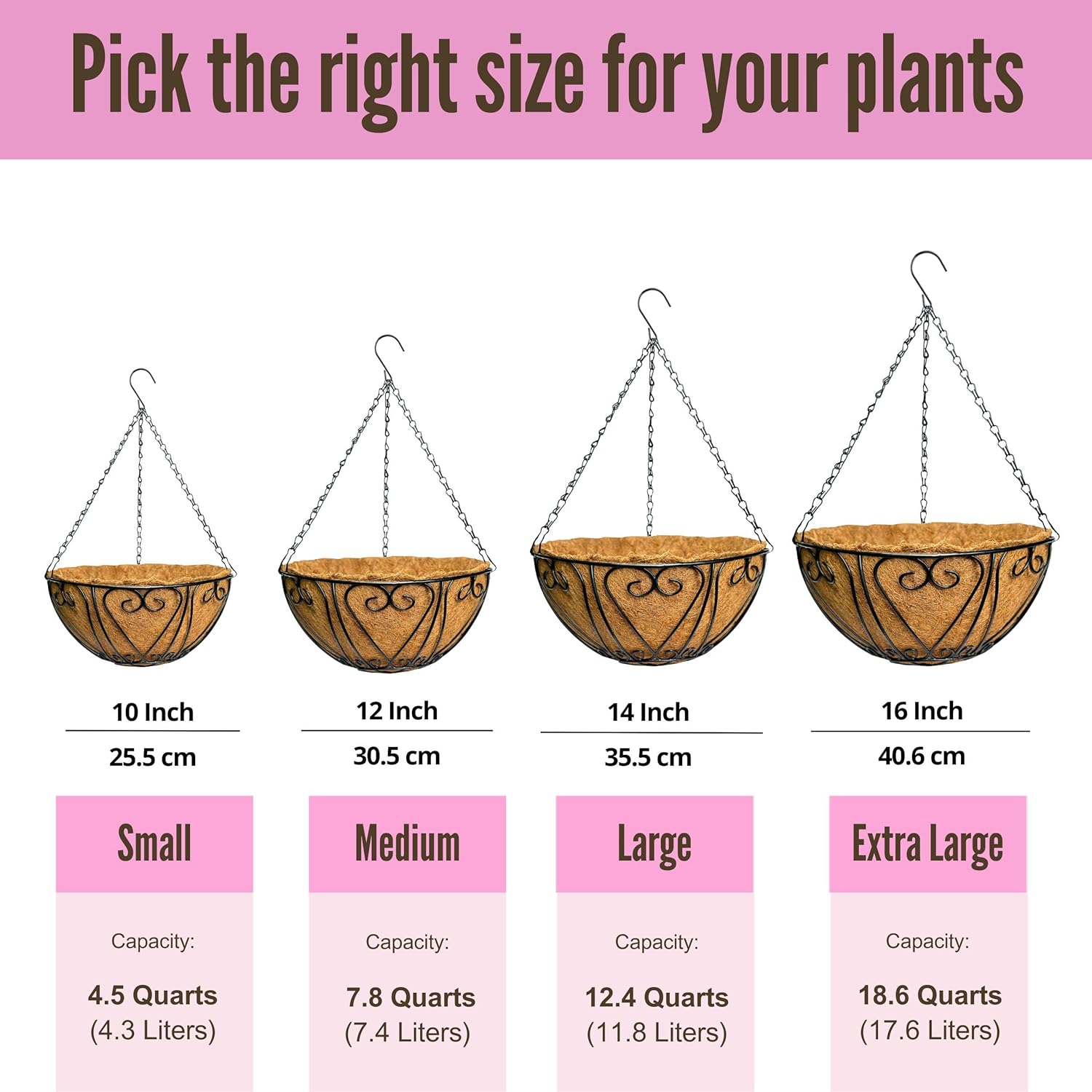 - 6-PACK SET: 16 Inch, extra large size. Pick the right size for your plants to prevent unpleasant experience and potential wastage on resources. Flowers and Plants are NOT included. These metal hanging planters are ready to hang with hanging chain and hook. Assembly not required