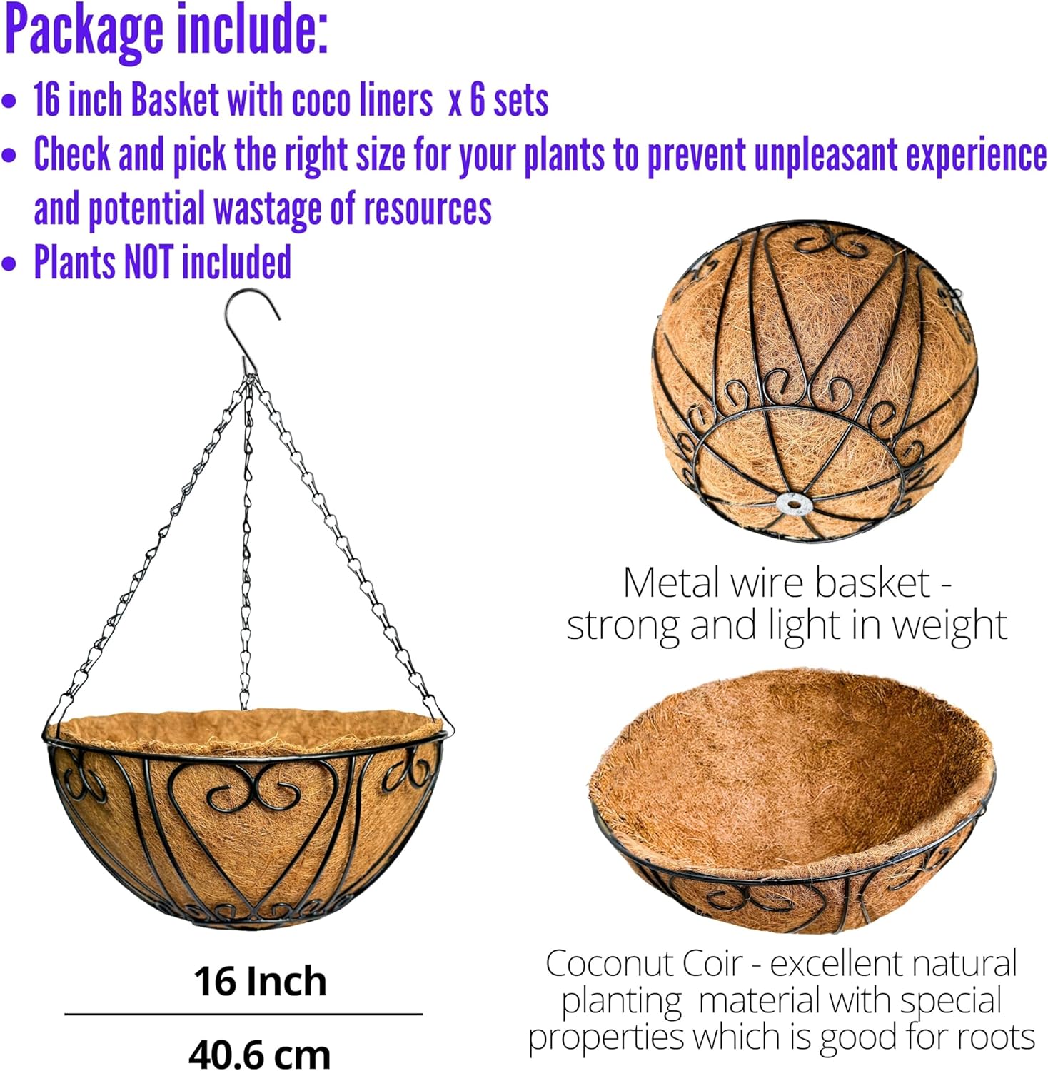 LaLaGreen Hanging Baskets for Plants (6 Pack, 16 Inch) Extra Large Hanging Flower Pot with Coco Liner Black Metal Wire Round Plants Holder with Hanger Hook Chain Outdoor Porch Patio Deck Balcony Decor