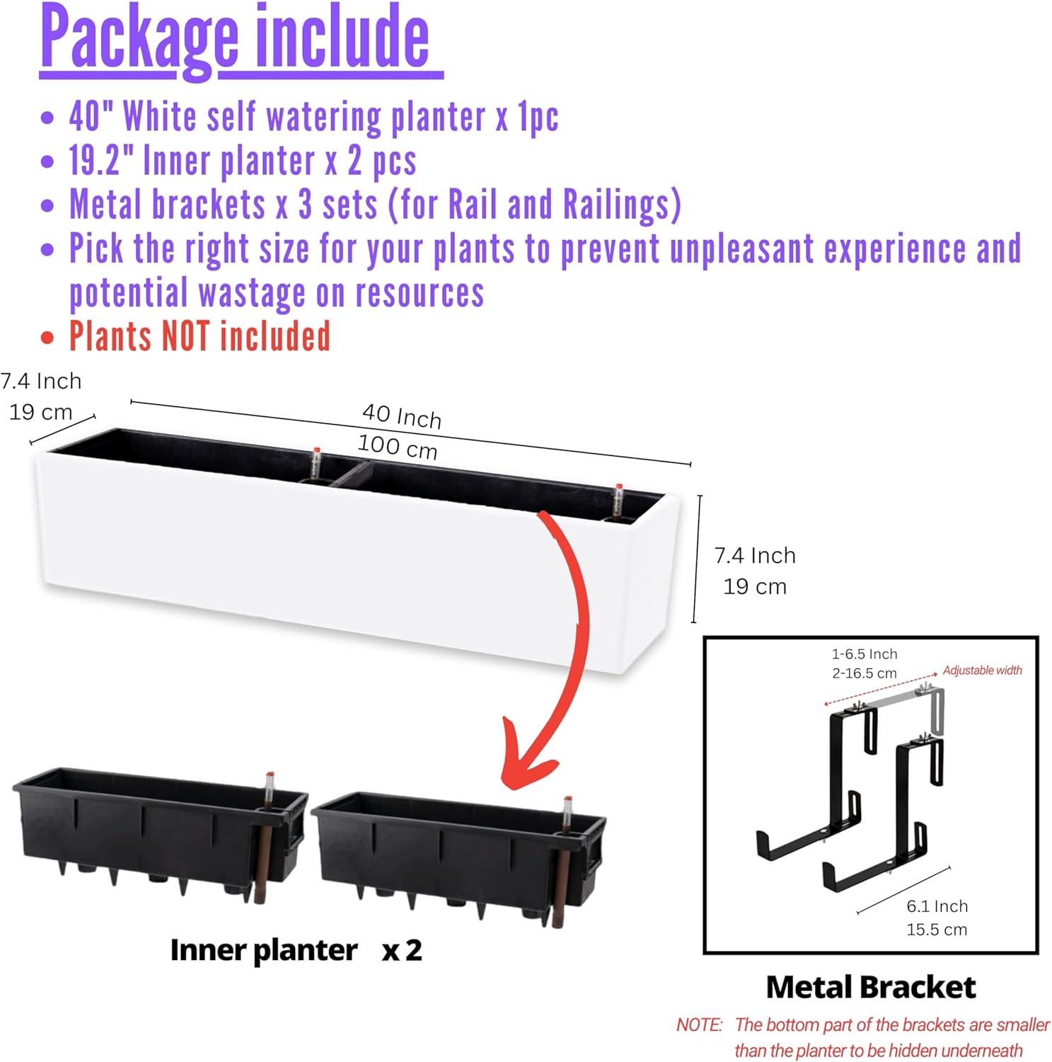 - 1 PACK SET: 40 Inch, 3 brackets are included due to its big and long size white deck planter with drainage holes, check image for detailed dimension. Pick the right size for your plants to prevent unpleasant experience and potential wastage on resources