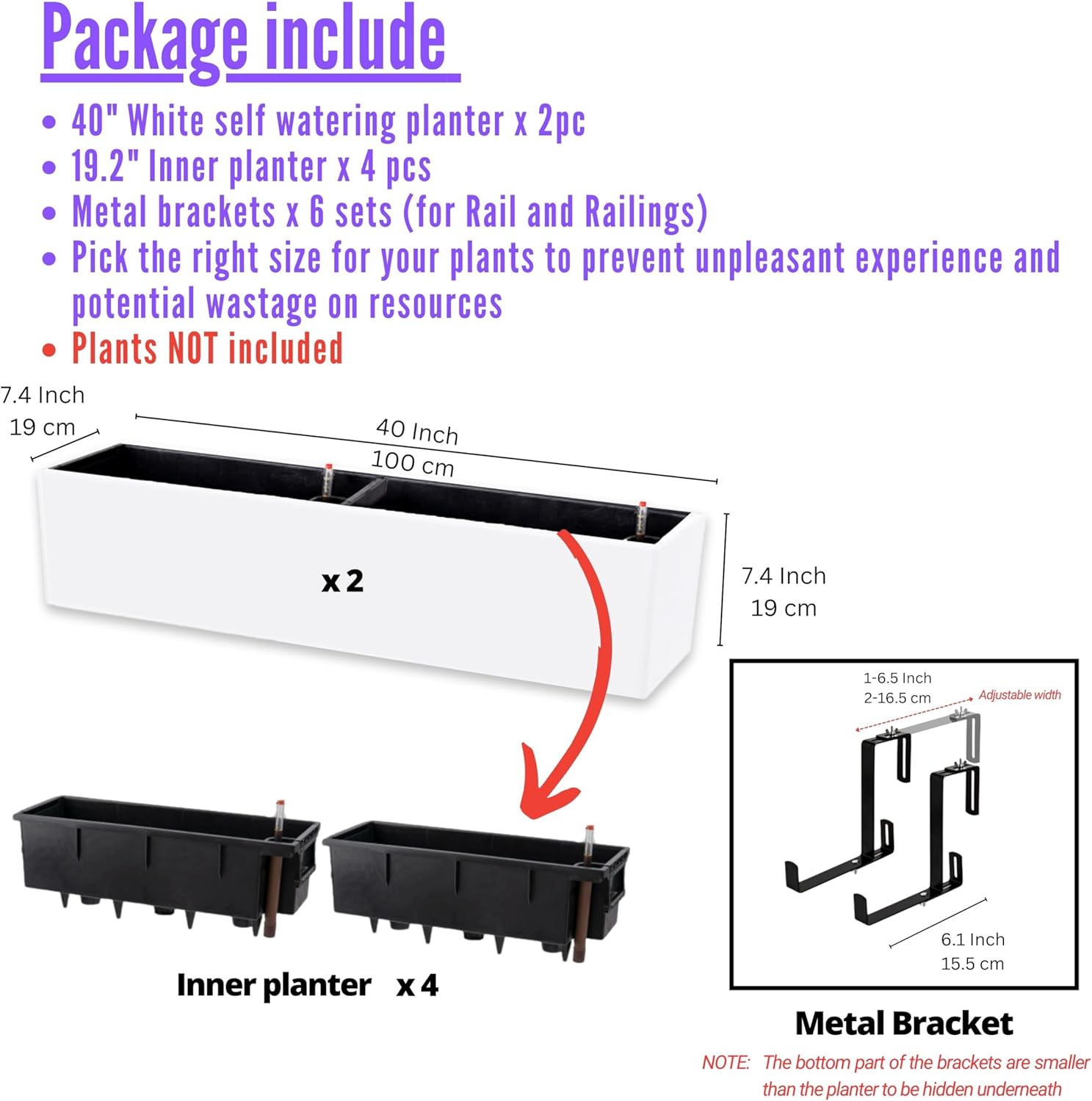 - 2 PACK SET: 40 Inch, 3 brackets are included due to its big and long size white deck railing planter with drainage holes, check image for detailed dimension. Pick the right size for your plants to prevent unpleasant experience and potential wastage on resources