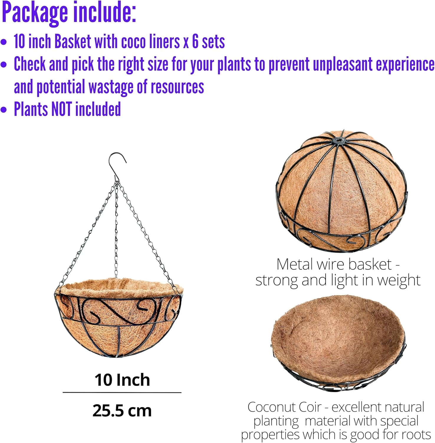 LaLaGreen Hanging Planter for Outdoor Plants (10 Inch, 6 Pack) Hanging Baskets with Coco Liner, Black Metal Wire Flower Basket Pots with Hook Hanger Balcony Porch Farmhouse Country Style Garden Decor