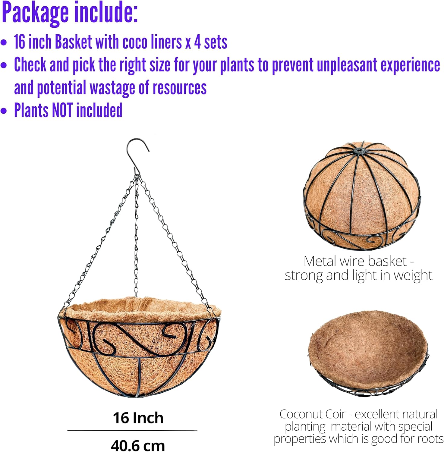 - 4-PACK SET, 16 Inch, mini size. Pick the right size for your plants to prevent unpleasant experience and potential wastage on resources. Flowers and Plants are NOT included. These metal hanging planters are ready to hang with hanging chain and hook. Assembly not required.