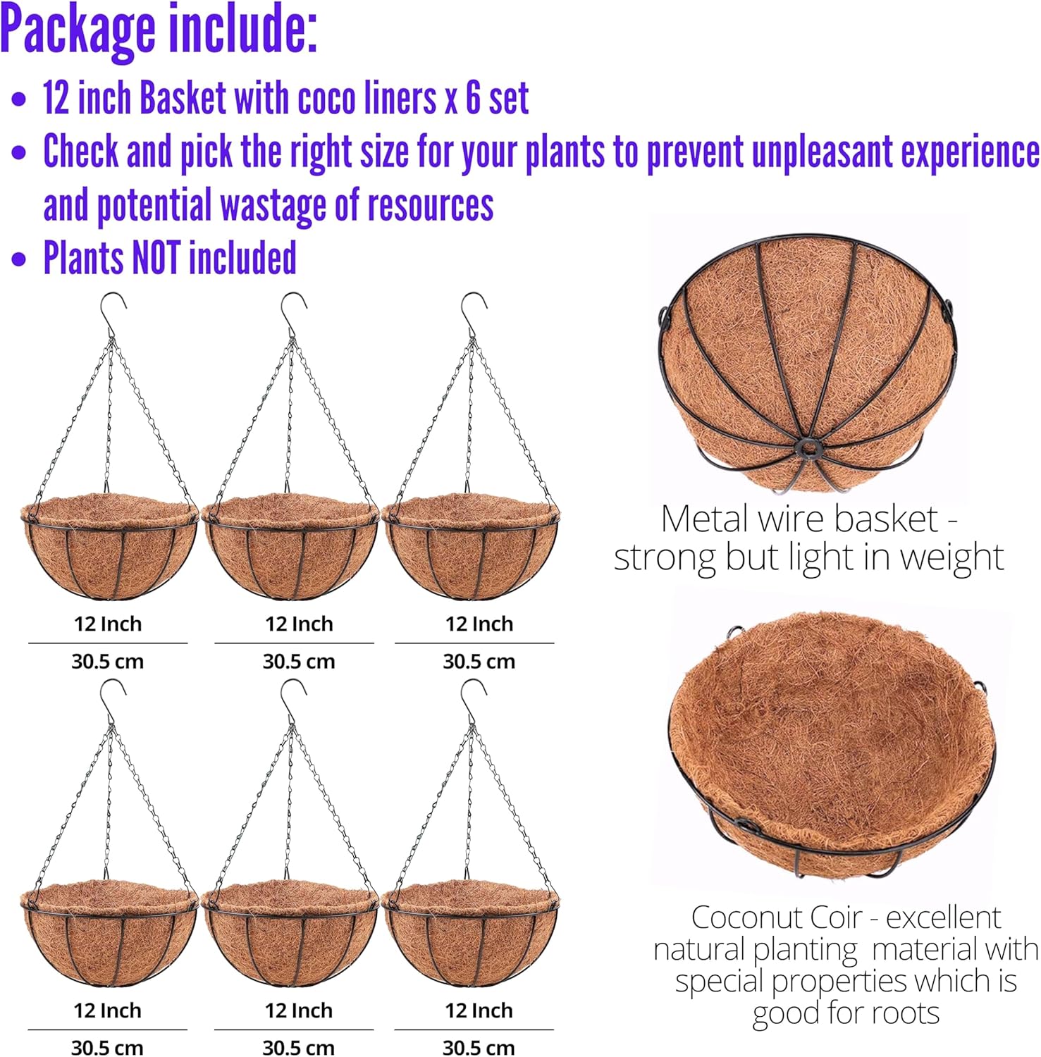 - 6-PACK SET: 12 inch, medium size. Pick the right size for your plants to prevent unpleasant experience and potential wastage on resources. Flowers and Plants are NOT included. These metal wire hanging flower pots are ready to hang with coco liners, metal hanging chain and hook. Assembly not required