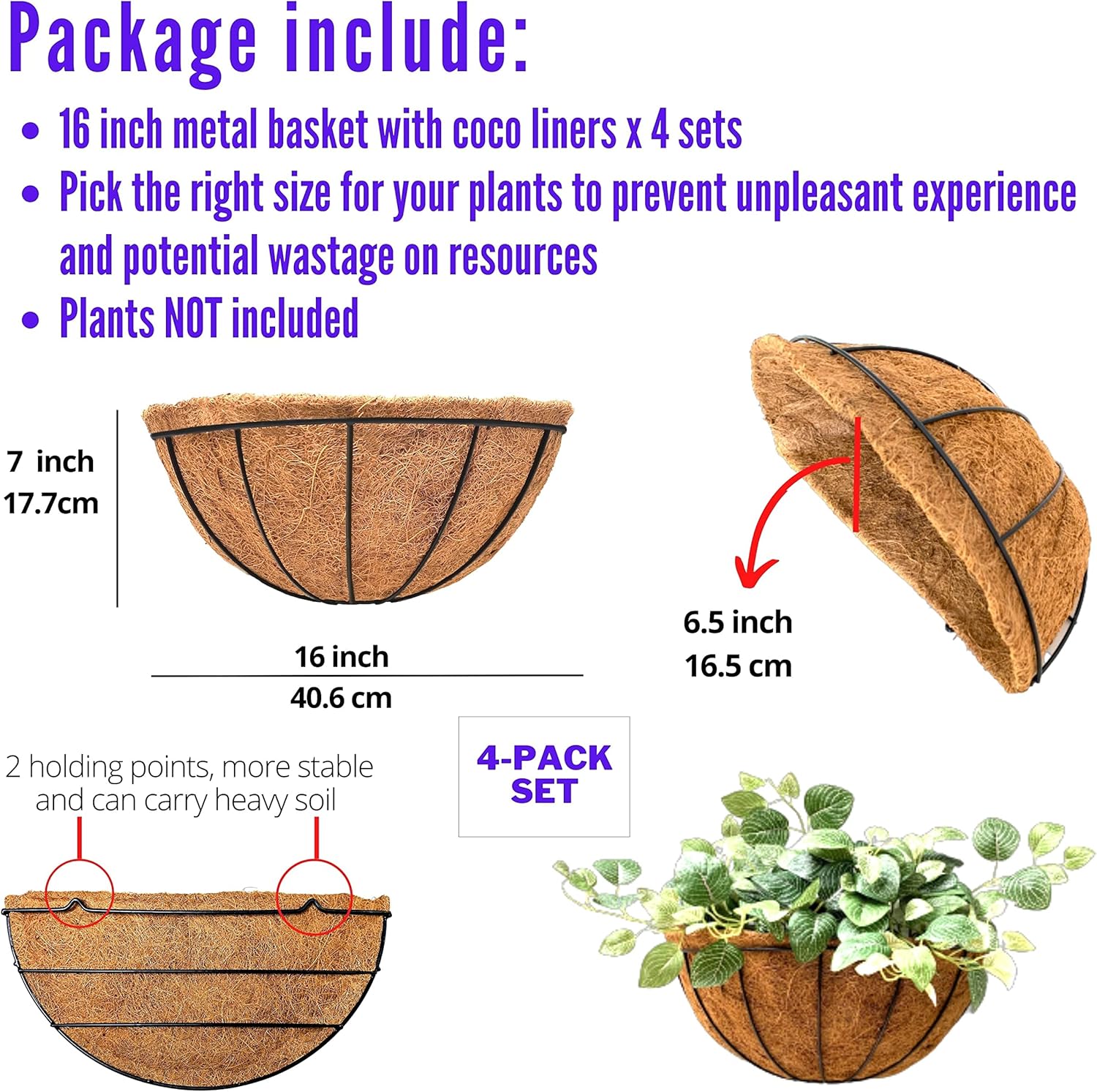LaLaGreen Large Wall Flower Baskets, 4 Pack, 16 Inch Rail Planter for Outdoor Plants, Metal Wire Plants Holders with Coco Liner Outside Fence Balcony Garden Pots Railings Hanging Deck Porch Decor