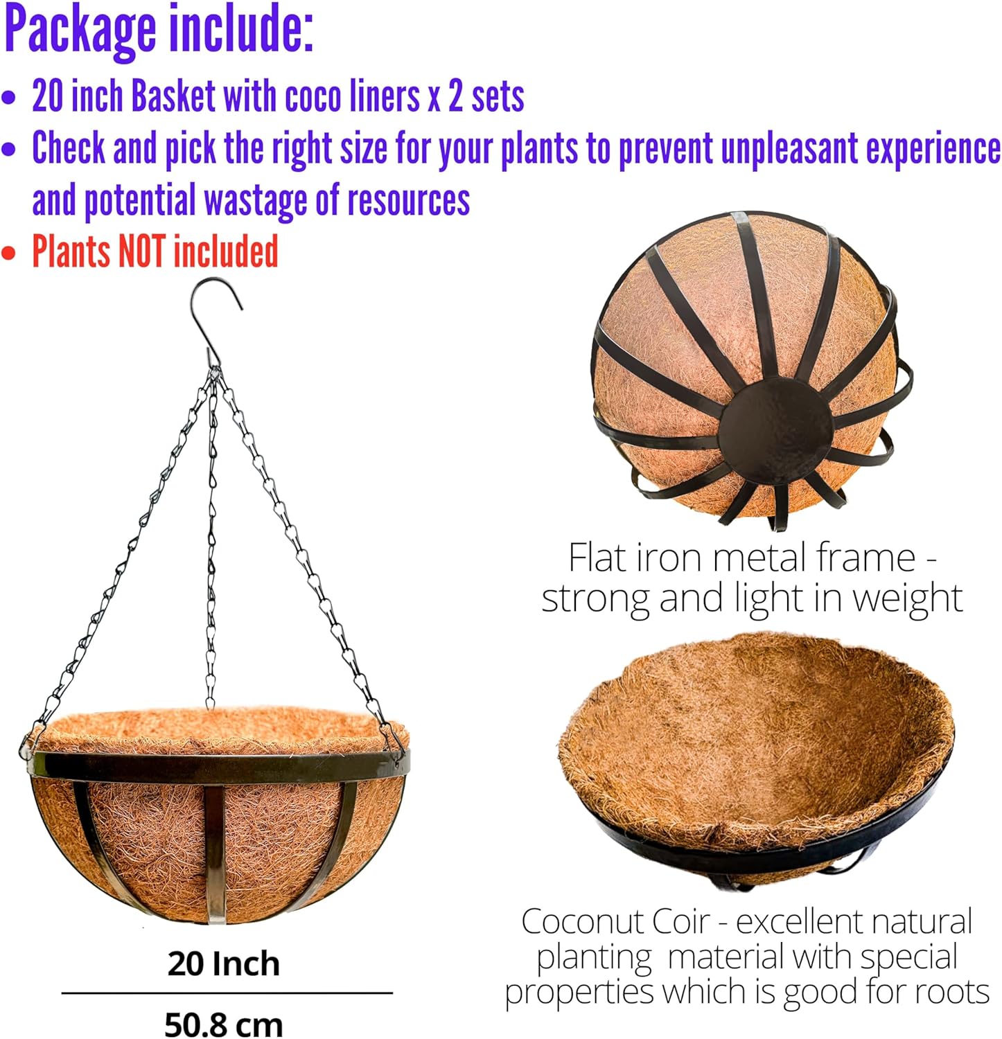 - 2-PACK SET: 20 inch, extra large size. Pick the right size for your plants to prevent unpleasant experience and potential wastage on resources. Flowers and Plants are NOT included. These metal wire hanging flower pots are ready to hang with coco liners, metal hanging chain and hook. Assembly not required