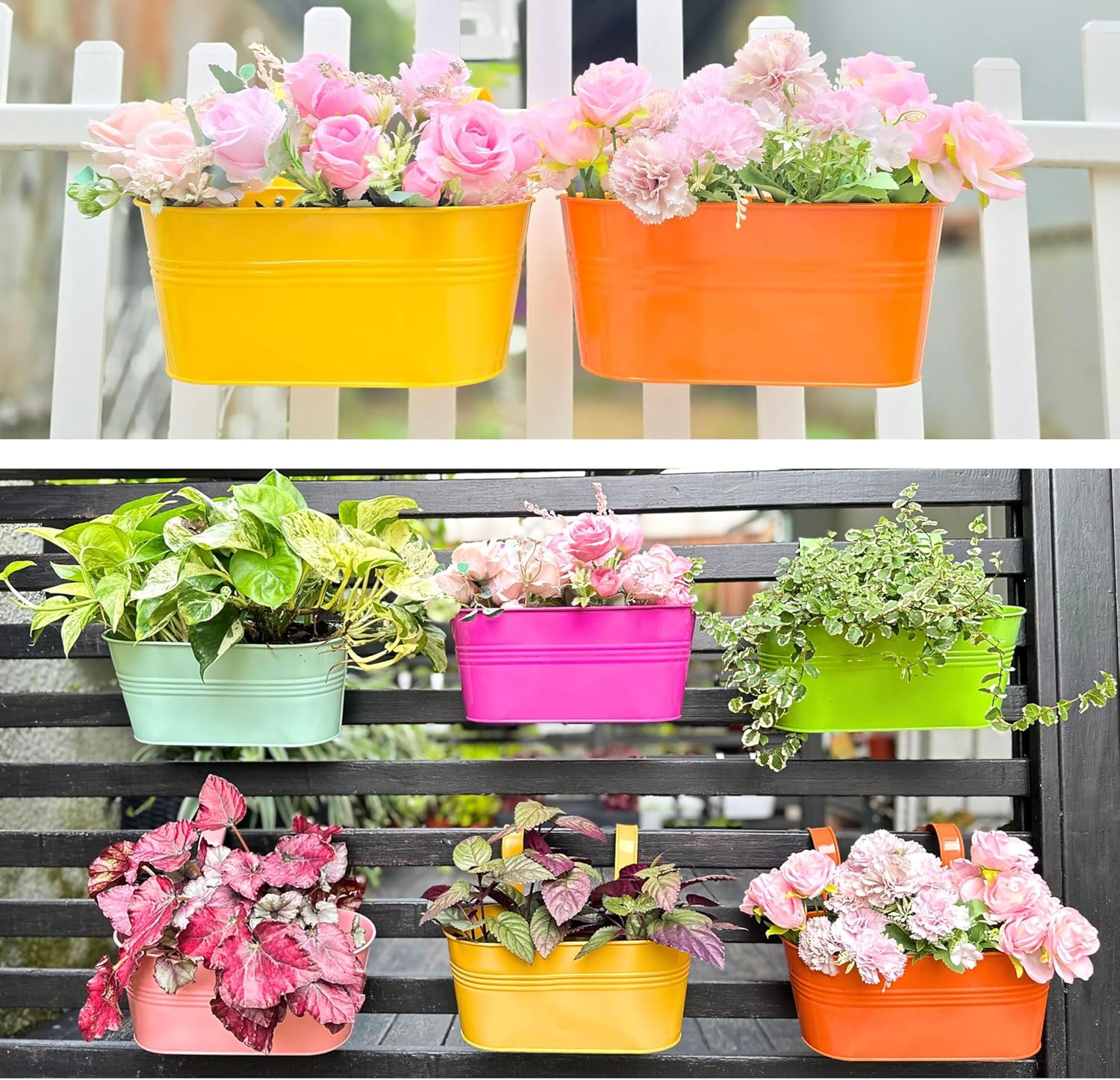- MULTI-PURPOSE: They can be used as fence planters, and hang over the rail and railing outside your house or apartment. Growing tasty and edible vegetables and fruits such as strawberries on the balcony will be fun. Inside the house, use them as window flower box for your lovely herbs or place dry or artificial flowers to create a focal point in your indoor living space. They can be used as a small storage organizer holder for bathroom or household items too