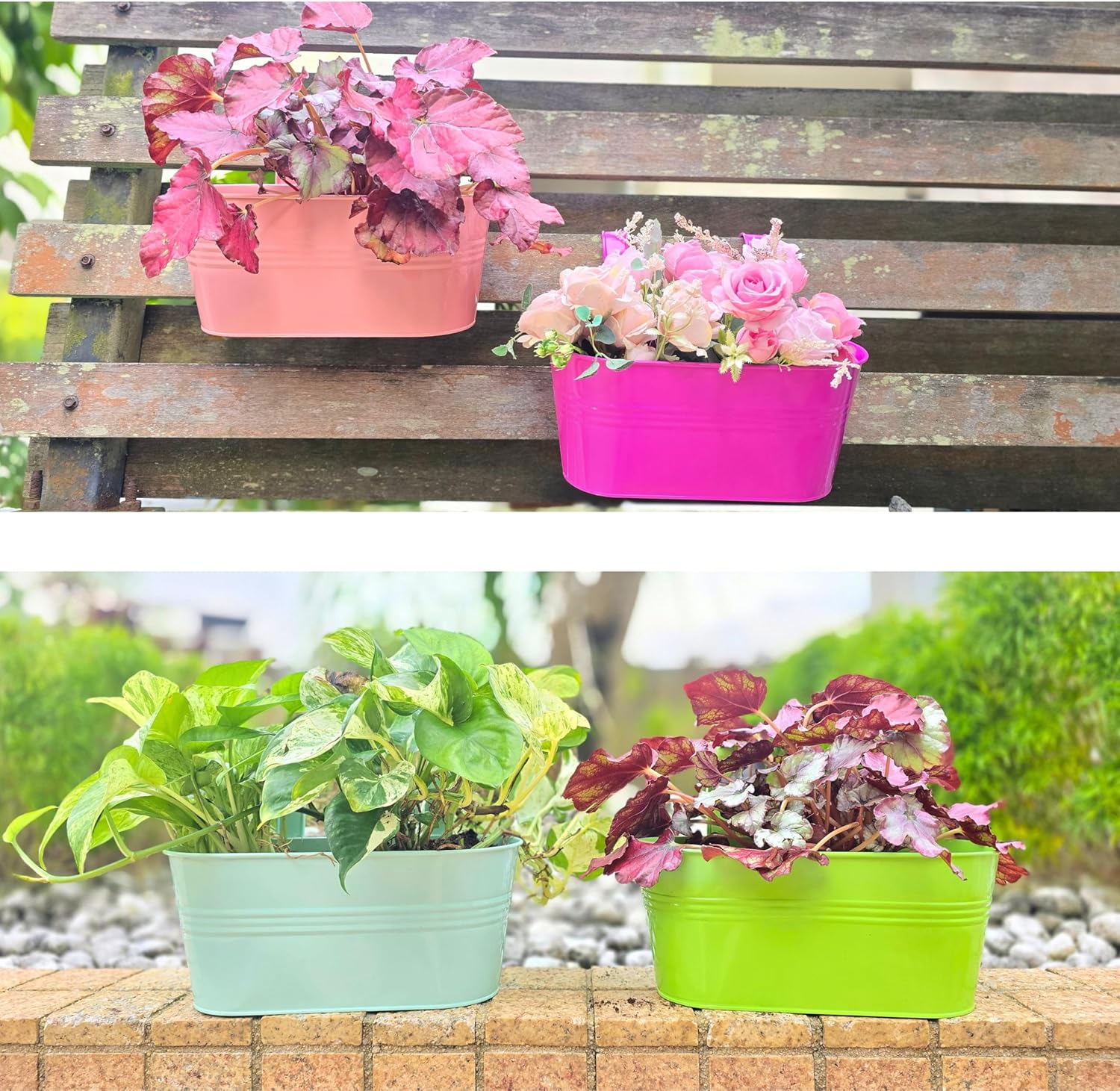 - TRENDY DECORATION: Minimalist style, simple and elegant, adds instant charm to your living space. These colorful planter boxes outdoor are perfect as modern vintage decor for a balcony garden, fence, bathroom, patio, deck, or porch. Create beautiful table centerpiece decorations for your living or dining room with live or artificial succulents, cacti or colorful flowers in this rounded rectangle planter basket