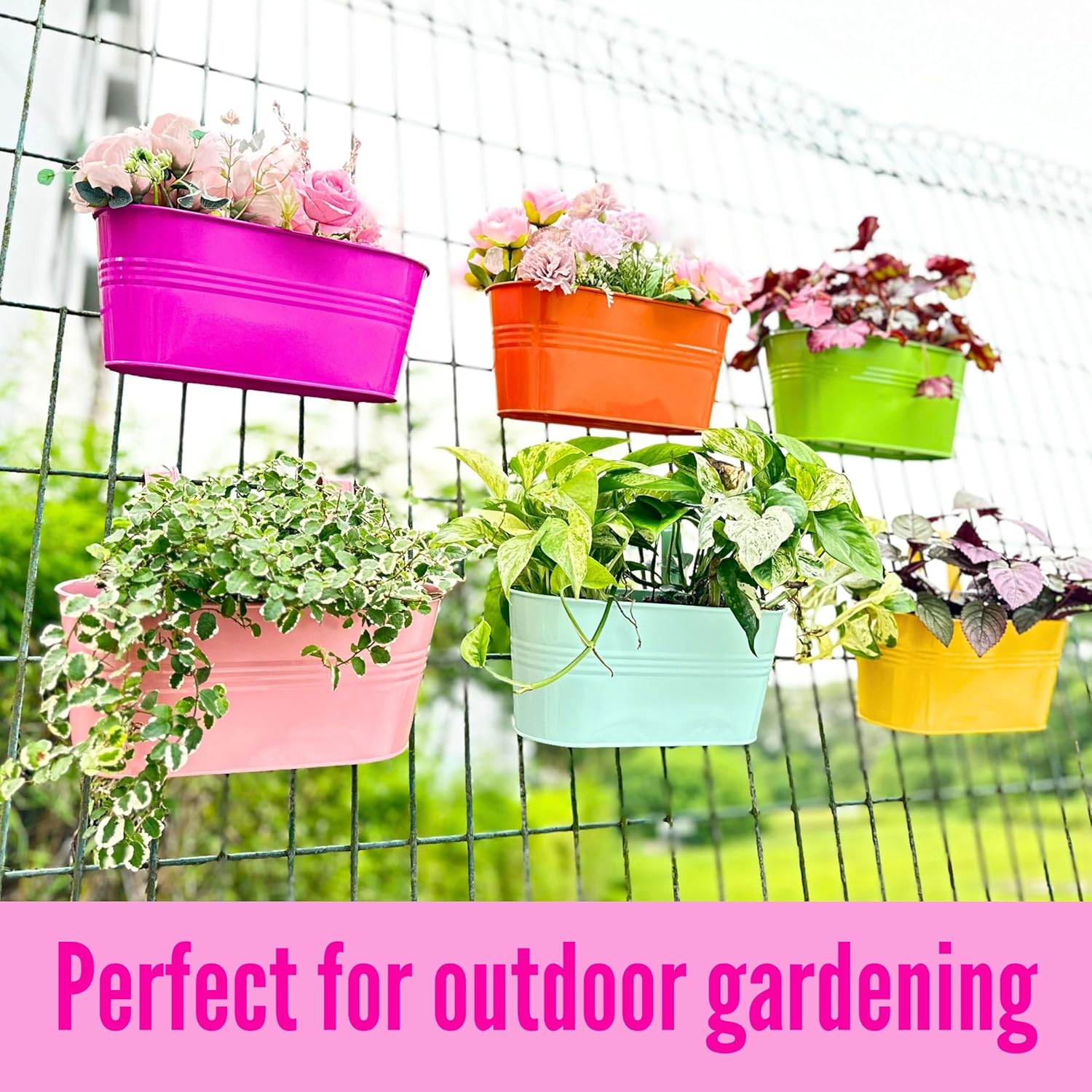 LaLaGreen Outdoor Hanging Planter (11.2 Inch, 6 Pack) Light Blue, Green, Neon Pink, Yellow, Orange, Peachy Pink Metal Iron Window Box Flower Pot Deck Railings Fence Rail Bucket Porch Home Garden Decor