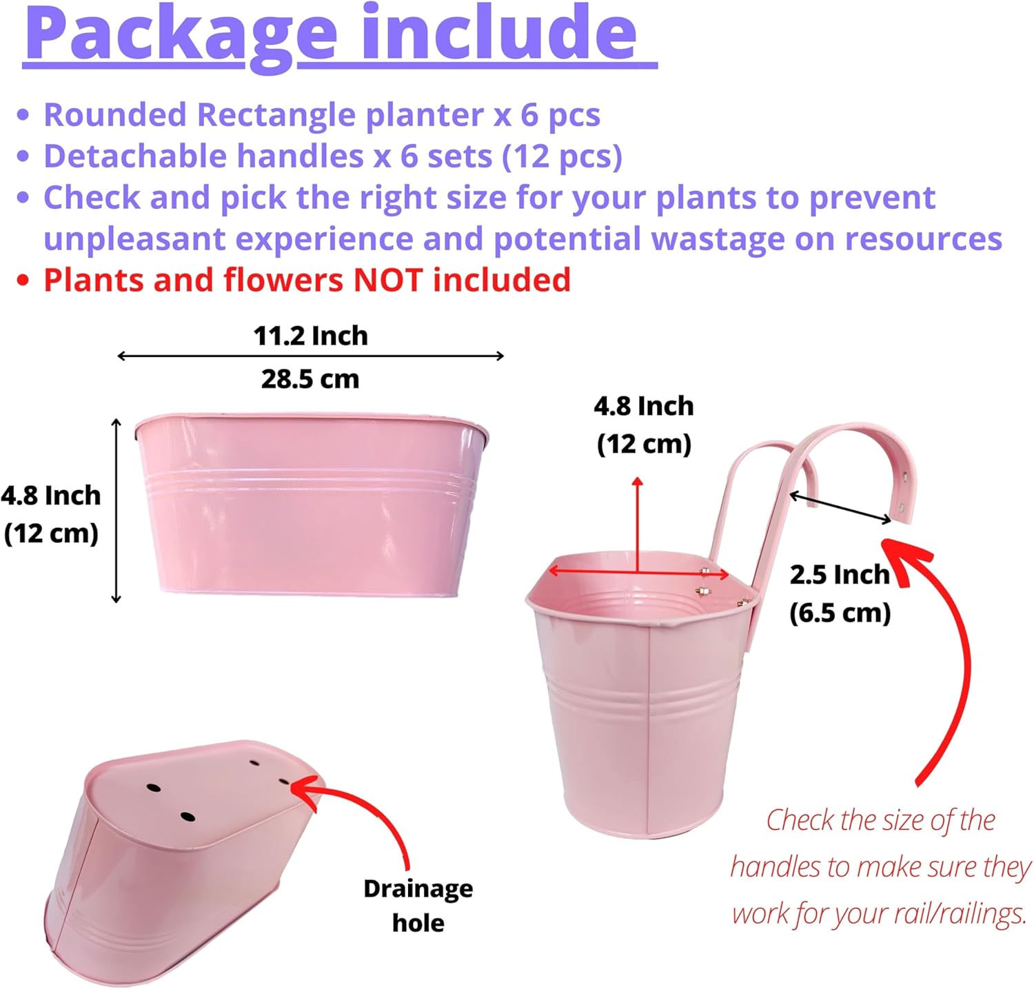 - IMPROVED DESIGN: 1) Handle is attached to the flower bucket by screws which is stronger and lasting - no more broken handles 2) Detachable handles are adjustable with two ways to hang the planter over the rail. 3) With the small holes at the back, these railings planters can be mounted on wall now, pls note screws NOT included. 4) With 4 drainage holes, you can tie the planters on flat big rail to display your lovely plants