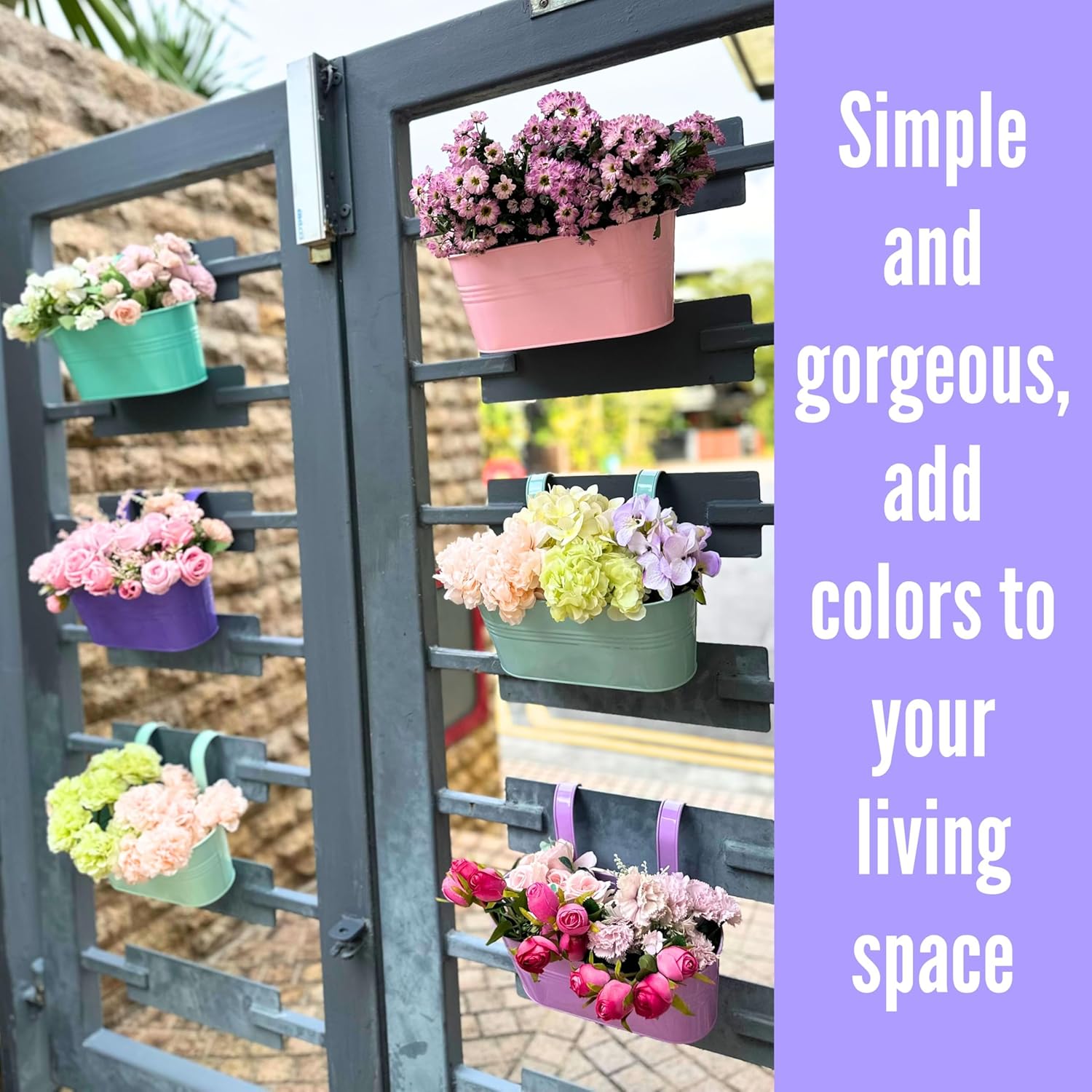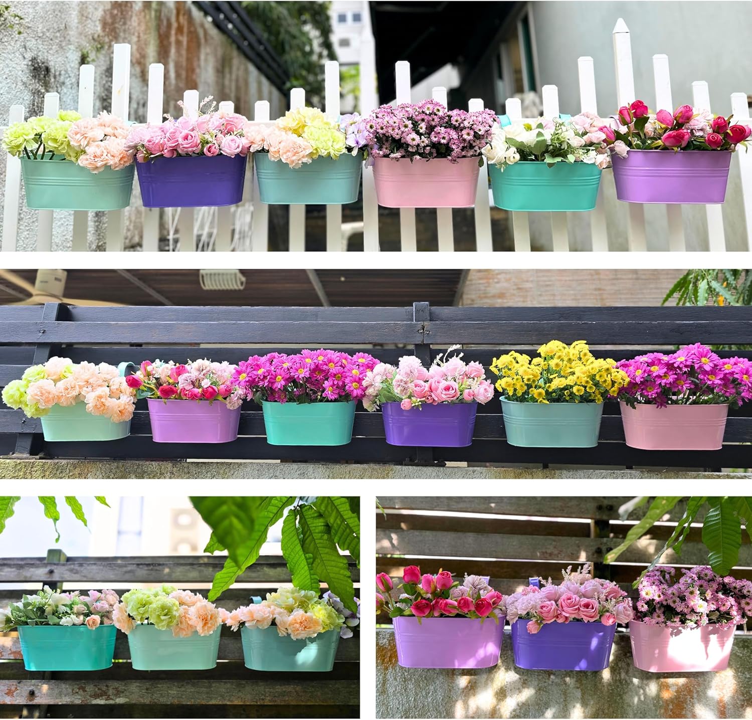 - 6 PACK SET: 11.2" light pink, light purple, turquoise, light blue, dark purple, cadet blue fence planters for outdoor plants with drainage holes, check image for detailed dimension. Pick the right size for your plants to prevent unpleasant experience and potential wastage on resources