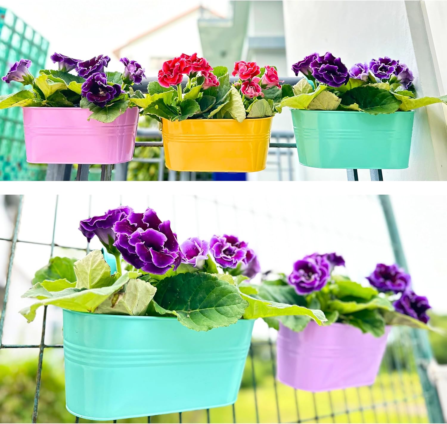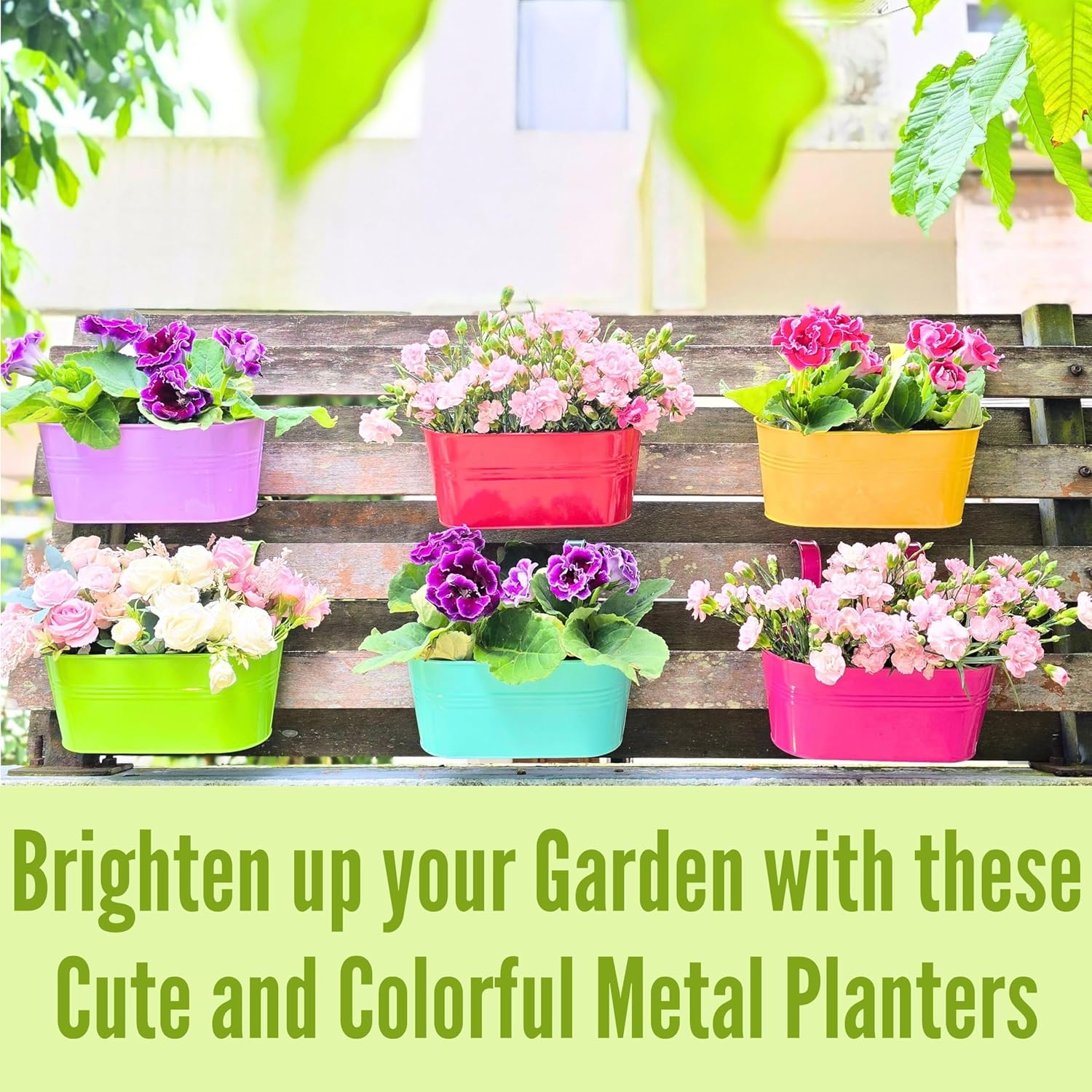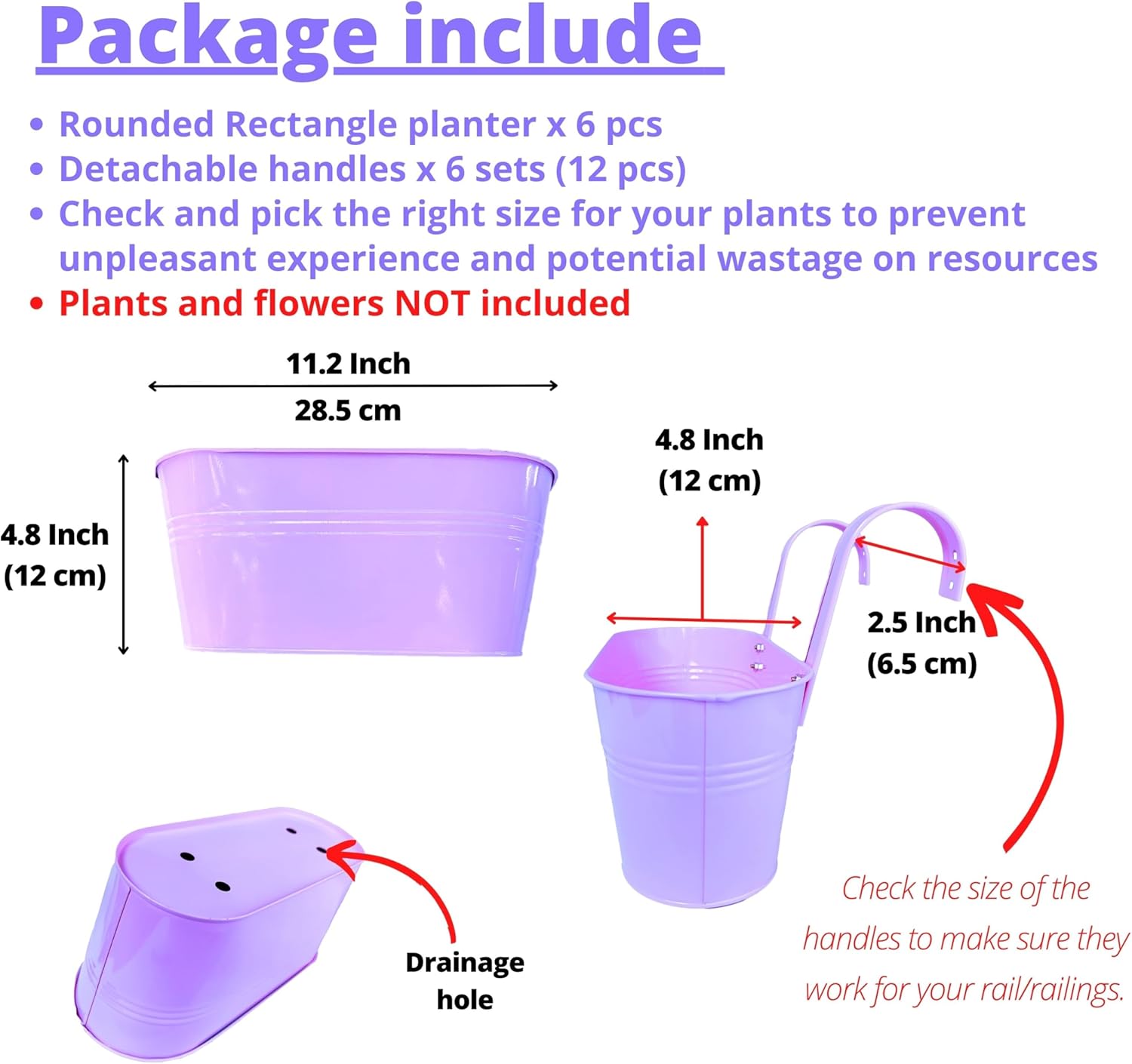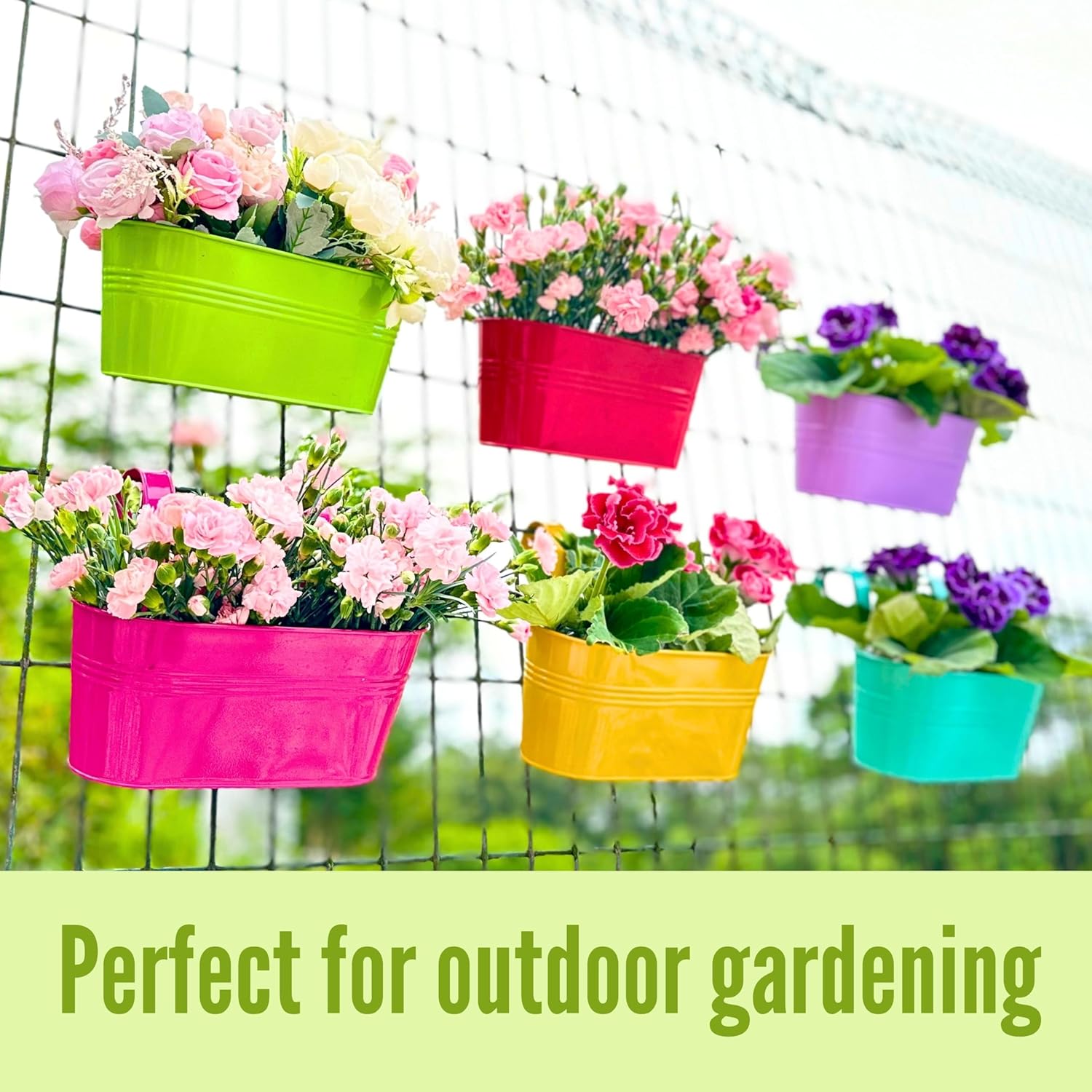 LaLaGreen Outdoor Hanging Planter (11.2 Inch, 6 Pack) Light Purple, Green, Yellow, Cadet Blue, Dark Pink, Red Metal Iron Window Box Flower Pot Deck Railings Balcony Fence Rail Porch Home Garden Decor