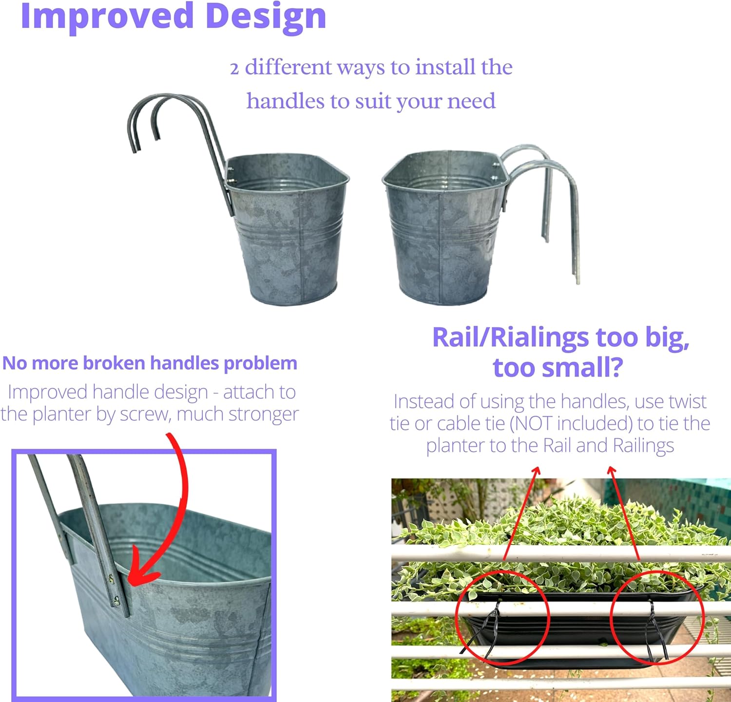 - IMPROVED DESIGN: 1) Handle is attached to the flower bucket by screws which is stronger and lasting - no more broken handles 2) Detachable handles are adjustable with two ways to hang the planter over the rail. 3) With the small holes at the back, these railings planters can be mounted on wall now, pls note screws NOT included. 4) With 4 drainage holes, you can tie the planters on flat big rail to display your lovely plants
