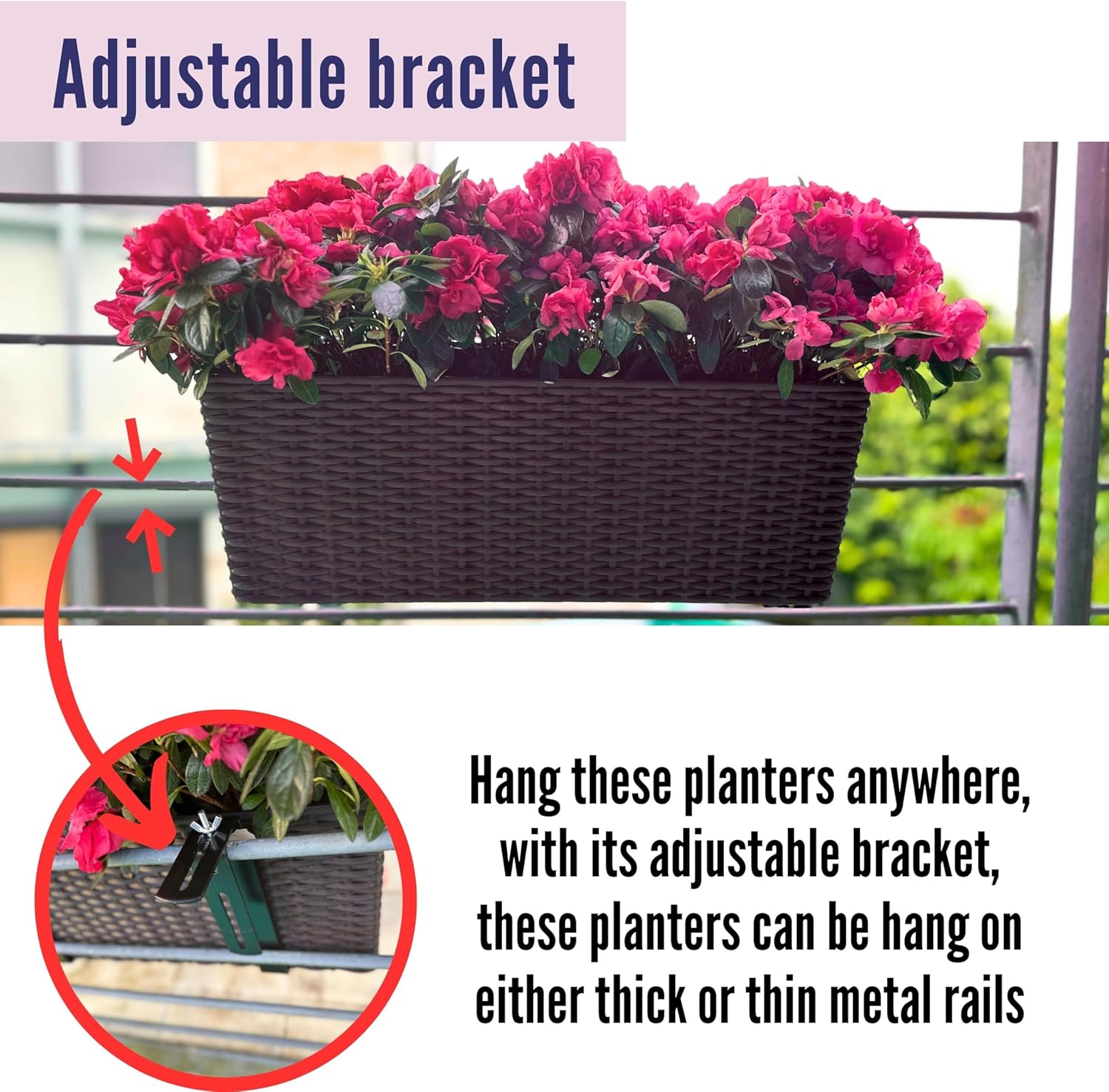 - STRONG & LIGHTWEIGHTt: These railing planter are durable and environmental friendly - not breakable and reusable. Better choice than ceramic and plastic pots. They are easy to use, just spend few mins to install the handles / hooks, then can start hanging them anywhere, Strong brown brackets are included and they are hidden at the bottom of the planter after installation. A more neat and modern look for your house or apartment.
