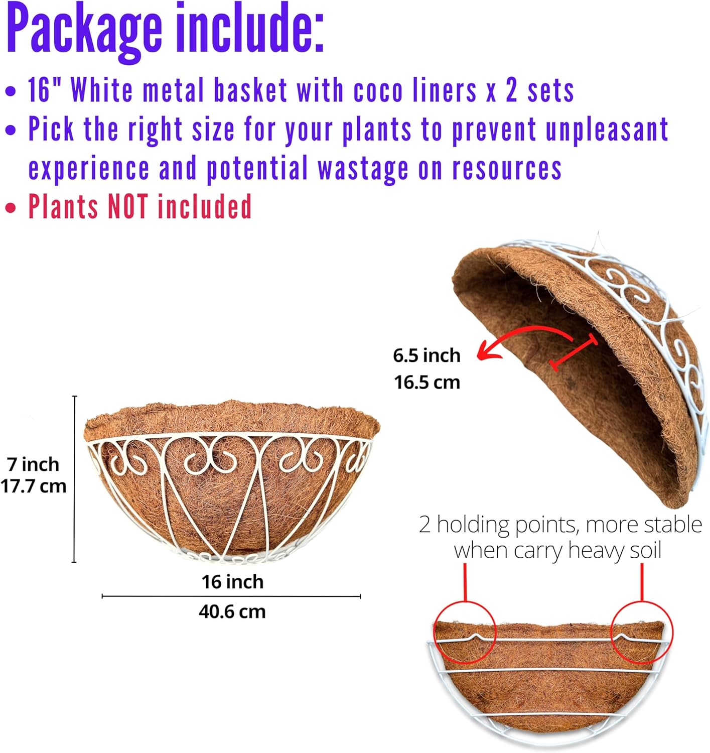 LaLaGreen Outdoor Wall Planters (2 Pack, 16 Inch) White Metal Wall Mounted Hanging Basket with Coco Liner, Large Flower Pot Plant Holder Planter for Fence Railing Deck Porch Balcony Modern Home Decor