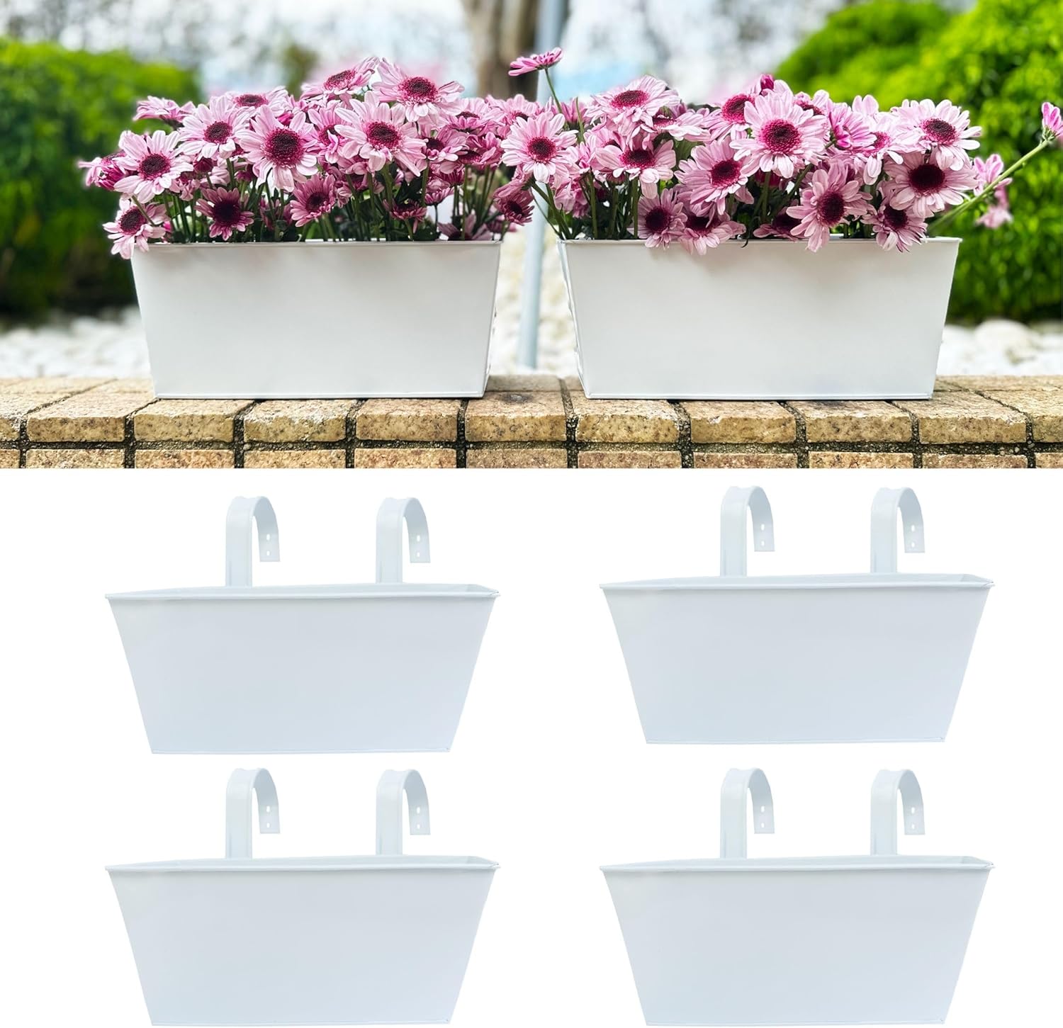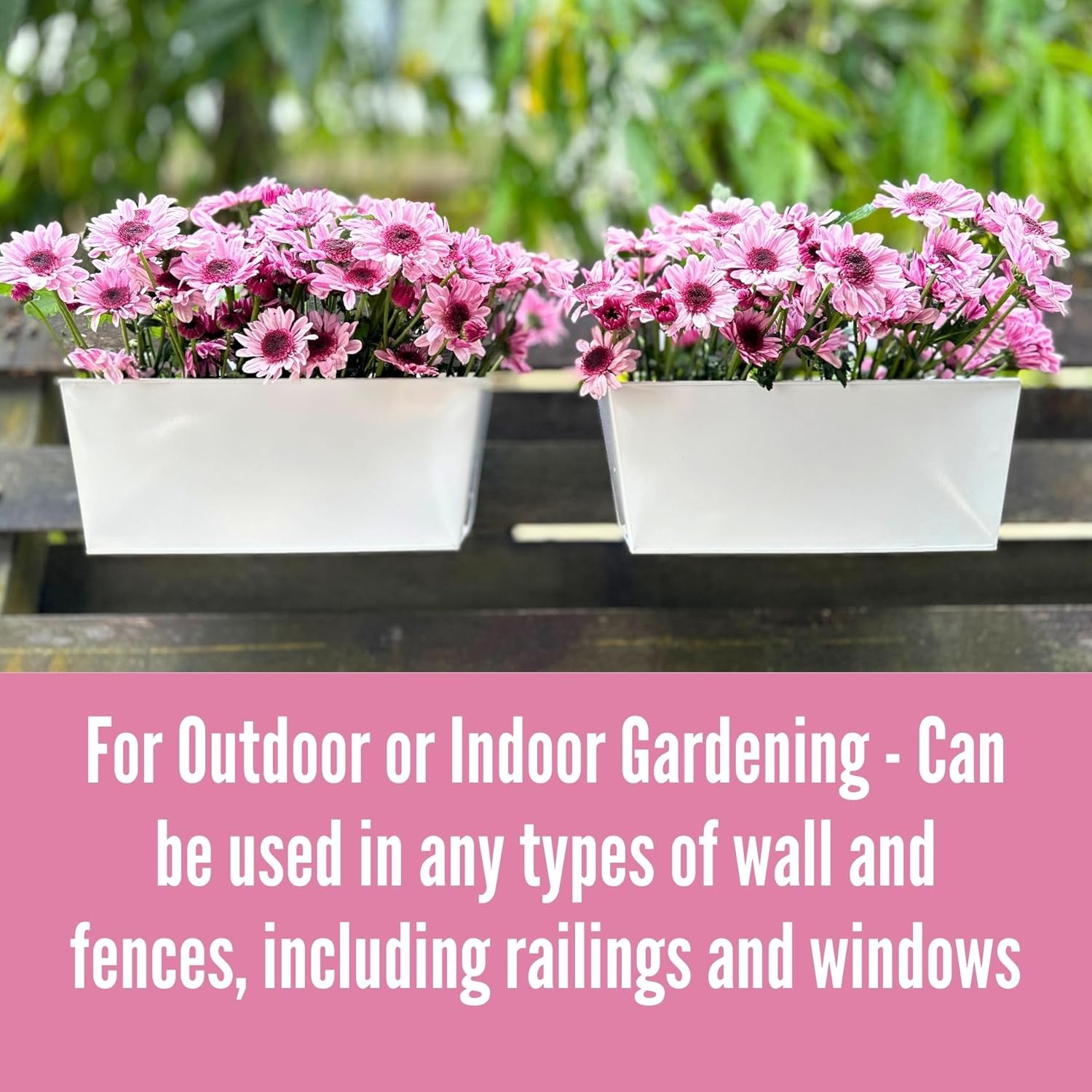 LalaGreen Planter Box (6 Pack, 12 Inch) Outdoor White Metal Rectangle Balcony Railing Fence Hanging Flower Pots for Strawberry, Succulent Herb Plant Holder Rustic Farmhouse Countryside Style Outside