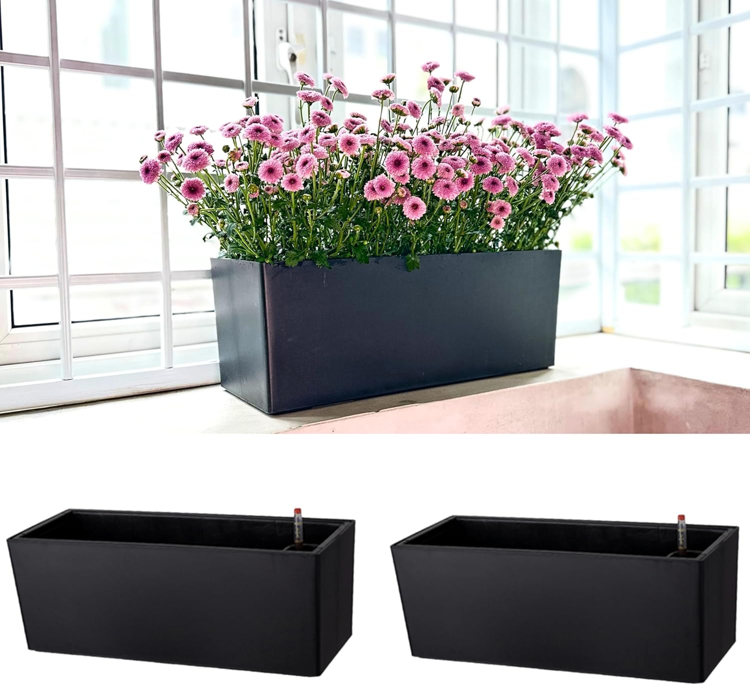 LaLaGreen Planter Box for Indoor Plants (2 Pack, 14 Inch) Black Rectangular Self Watering Flower Pot, Window Boxes Planters with Drainage Decorative Modern Balcony Windowsill Herb Home Garden Kitchen