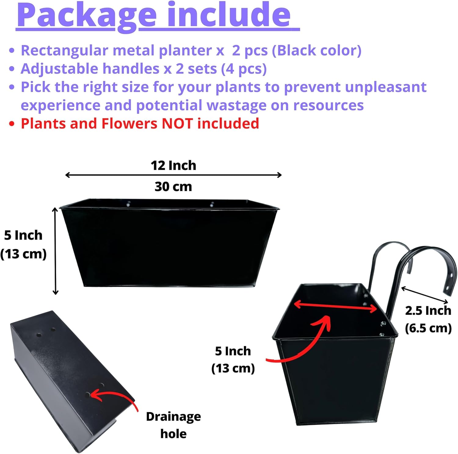 - 2 PACK SET: 12 Inch rail hanging planter are made from metal iron. This 12 inch Rail Hanging Planter is both durable and sturdy, making it perfect for use in any season. Check image for detailed dimension. Pick the right size for your plants to prevent unpleasant experience and potential wastage on resources.