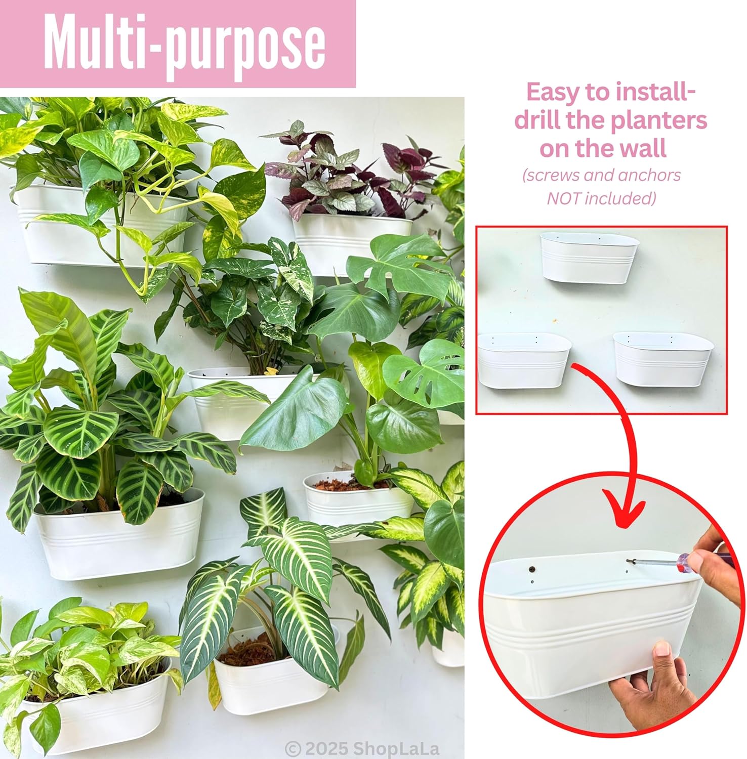 - IMPROVED DESIGN: 1) Handle is attached to the flower bucket by screws which is stronger and lasting - no more broken handles 2) Detachable handles are adjustable with two ways to hang the planter over the rail. 3) With the small holes at the back, these modern balcony planters can be mounted on wall to form a magnificent vertical garden, pls note screws NOT included. 4) With 4 drainage holes, you can tie the planters on flat big rail to display your lovely plants.