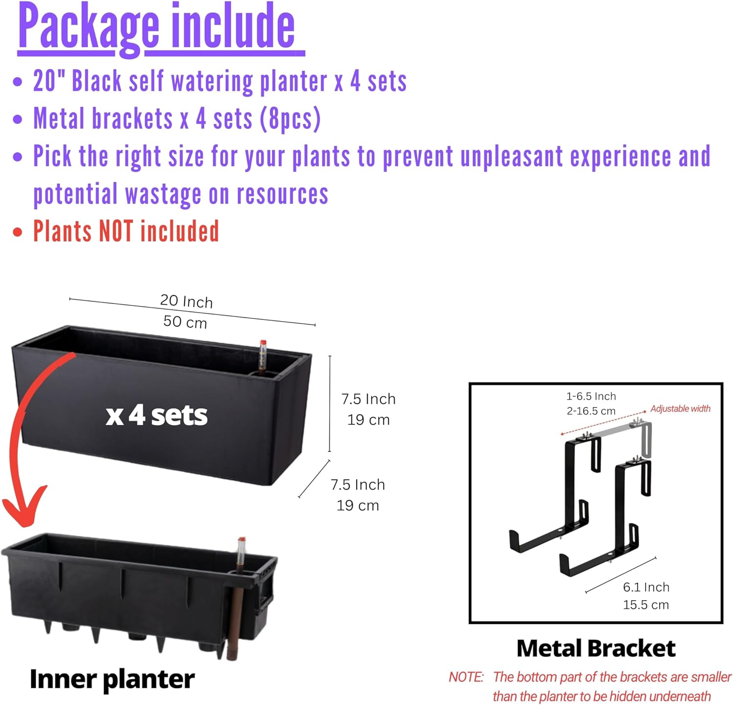 - 4 PACK SET: 20 inch, black flower boxes for railings. Pick the right size for your plant to prevent unpleasant experience and potential wastage on resources. Flowers and Plants are NOT included. Easy to use, no special assembly is required.