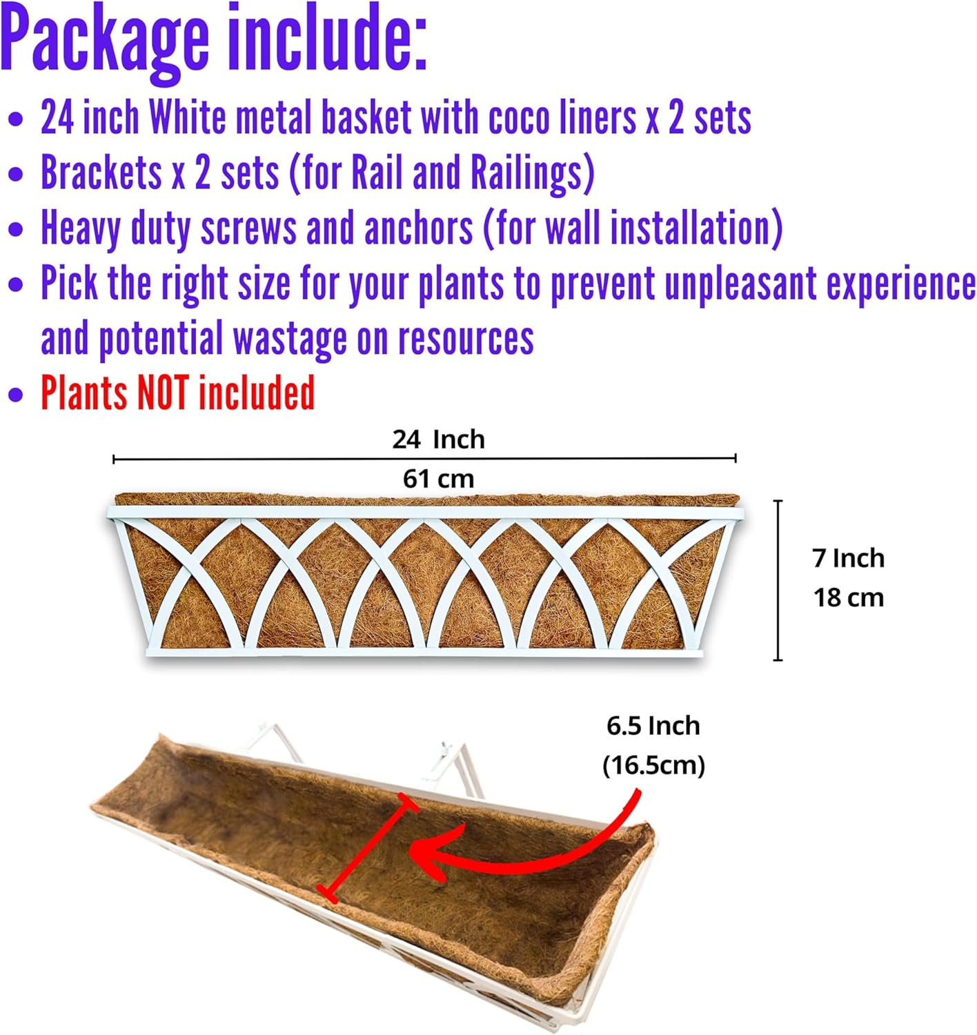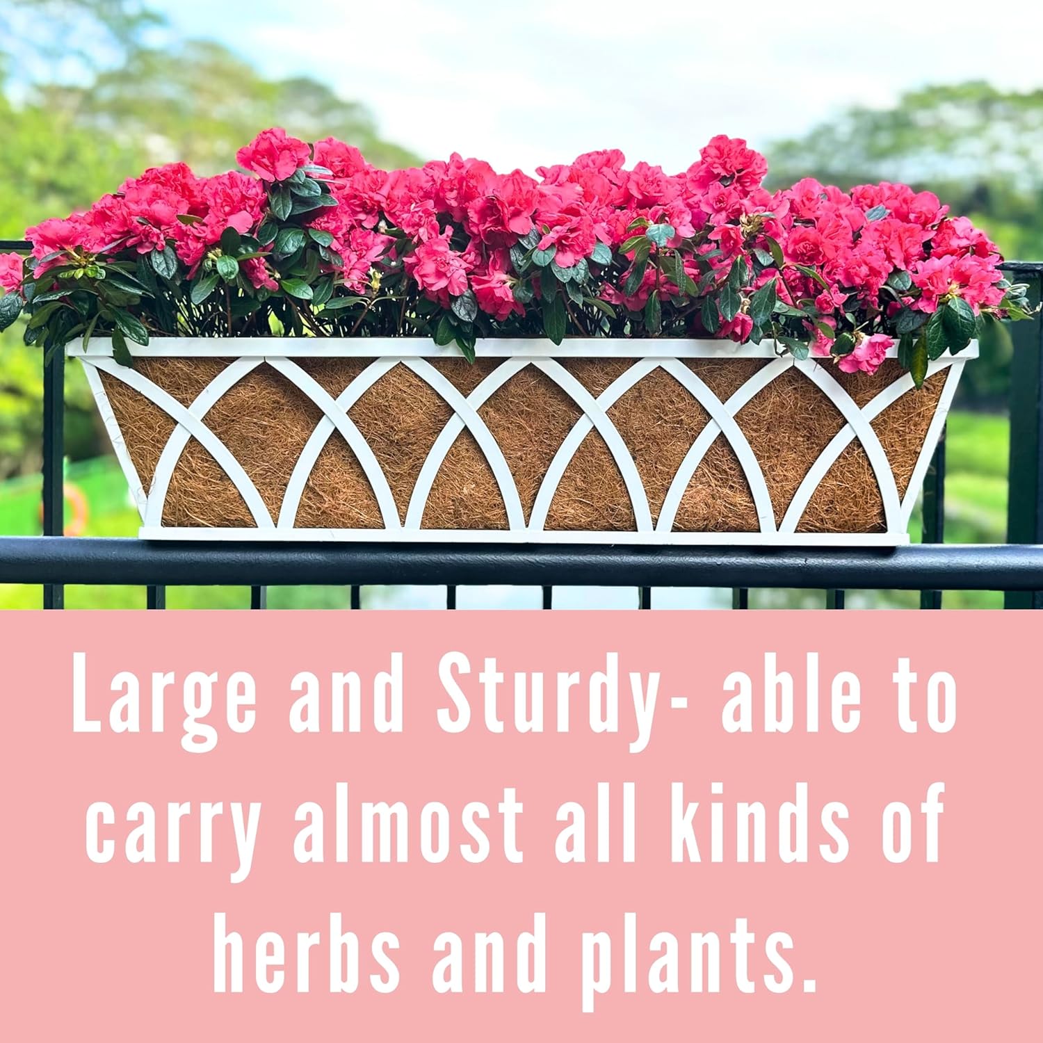 LaLaGreen Railing Planter Boxes (2 Pack, 24 Inch) White Metal Rectangular Window Flower Box with Coco Liner, Hanging Planters for Outdoor Plants Holder Deck Rail Fence Balcony Patio Porch Garden Decor