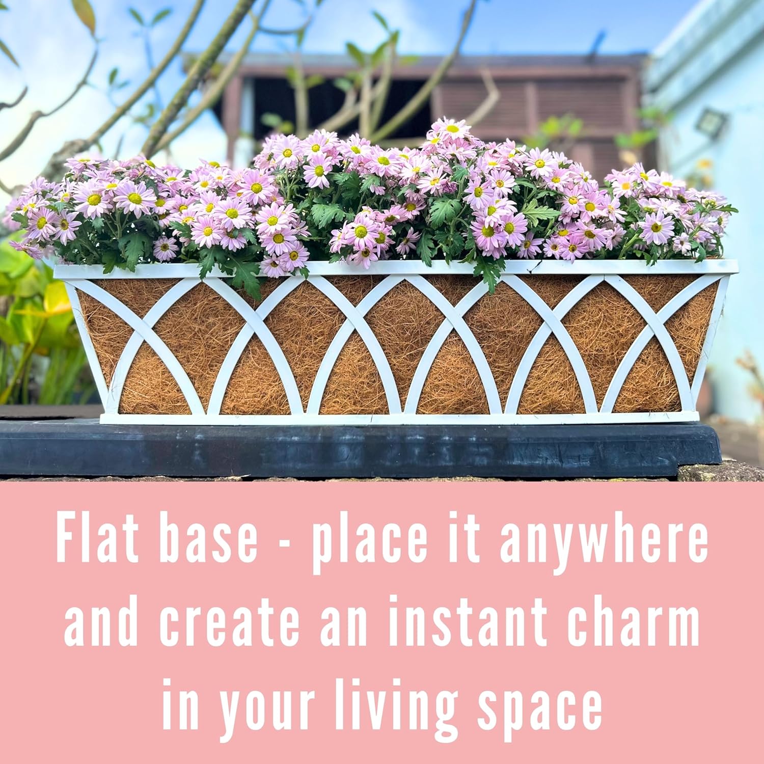 - MATERIAL FROM COCONUT: This planter boxes outdoor deck railing is filled with coco coir liners, which is excellent planting material for plants as it holds a good deal of water, and provides superior drainage and good air ventilation for the roots at the same time. Coir is a natural fiber extracted from coconut husks, making it a choice for your garden.
