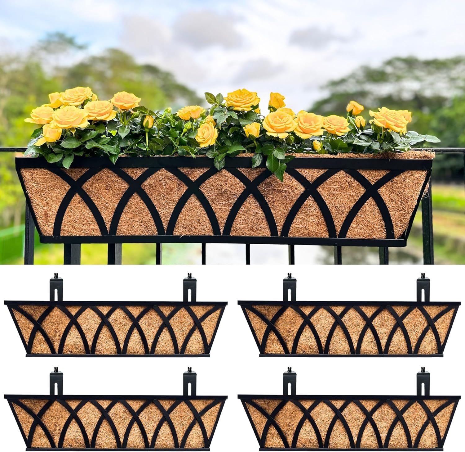 LaLaGreen Railing Planter Boxes (24 Inch, 4 Pack) Black Metal Rectangular Window Flower Box with Coco Liner, Wall Hanging Planters for Outdoor Plants Bracket Holder Deck Rail Fence Balcony Patio Porch