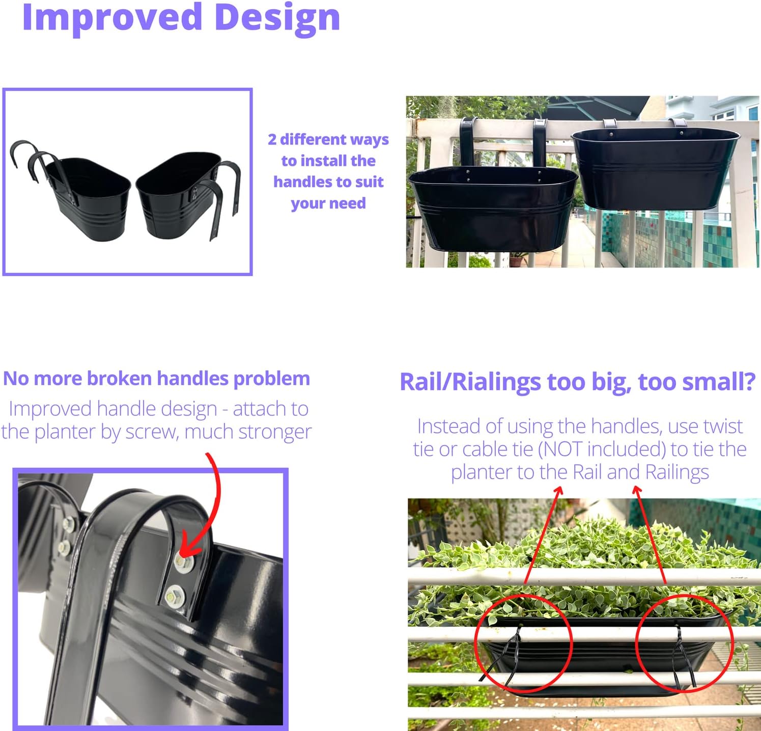 - IMPROVED DESIGN: 1) Handle is attached to the flower bucket by screws which is stronger and lasting - no more broken handles 2) Detachable handles are adjustable with two ways to hang the planter over the rail. 3) With the small holes at the back, these railings planters can be mounted on wall now, pls note screws NOT included. 4) With 4 drainage holes, you can tie the planters on flat big rail to display your lovely plants