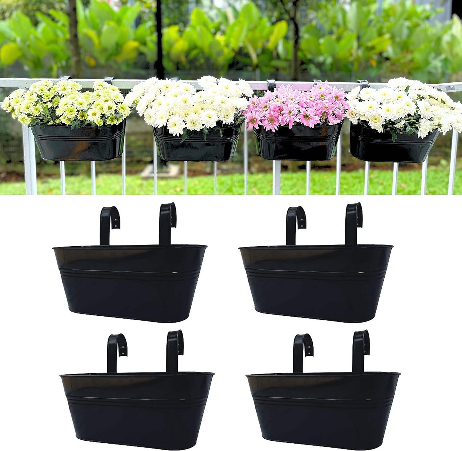 LaLaGreen Railing Planter Outdoor Plants (11.2 Inch, 2 Pack) Black Metal Iron Hanging Flower Pots Deck Rail Fence Hanging Bucket Modern Countryside Style Window Box Plant Holder with Hooks Porch Decor
