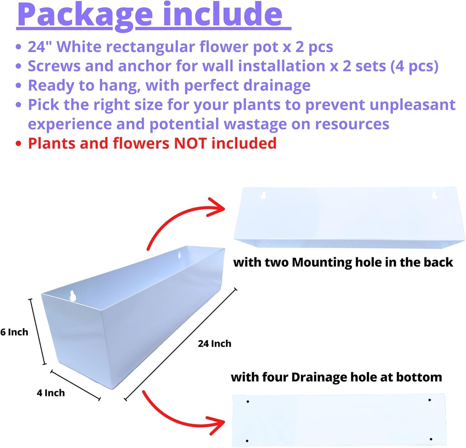 - 2 PACK SET: 24 inch, carbon steel white window planter box. Please check listing image and video for more details. Pick the right size for your plants to prevent unpleasant experience and potential wastage on resources