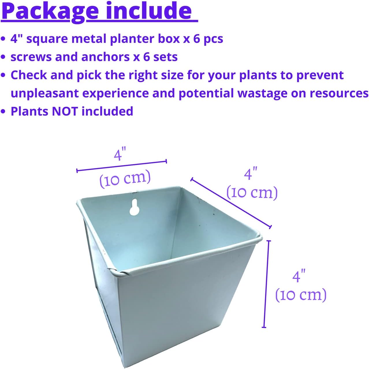 LaLaGreen Wall Planter - 6 Pack, 4 Inch Square Metal Wall Planter for Indoor Plants, Small White Wall Mounted Flower Pots Outdoor Herb Garden Decor, Balcony Railings Hanging Buckets Porch Patio