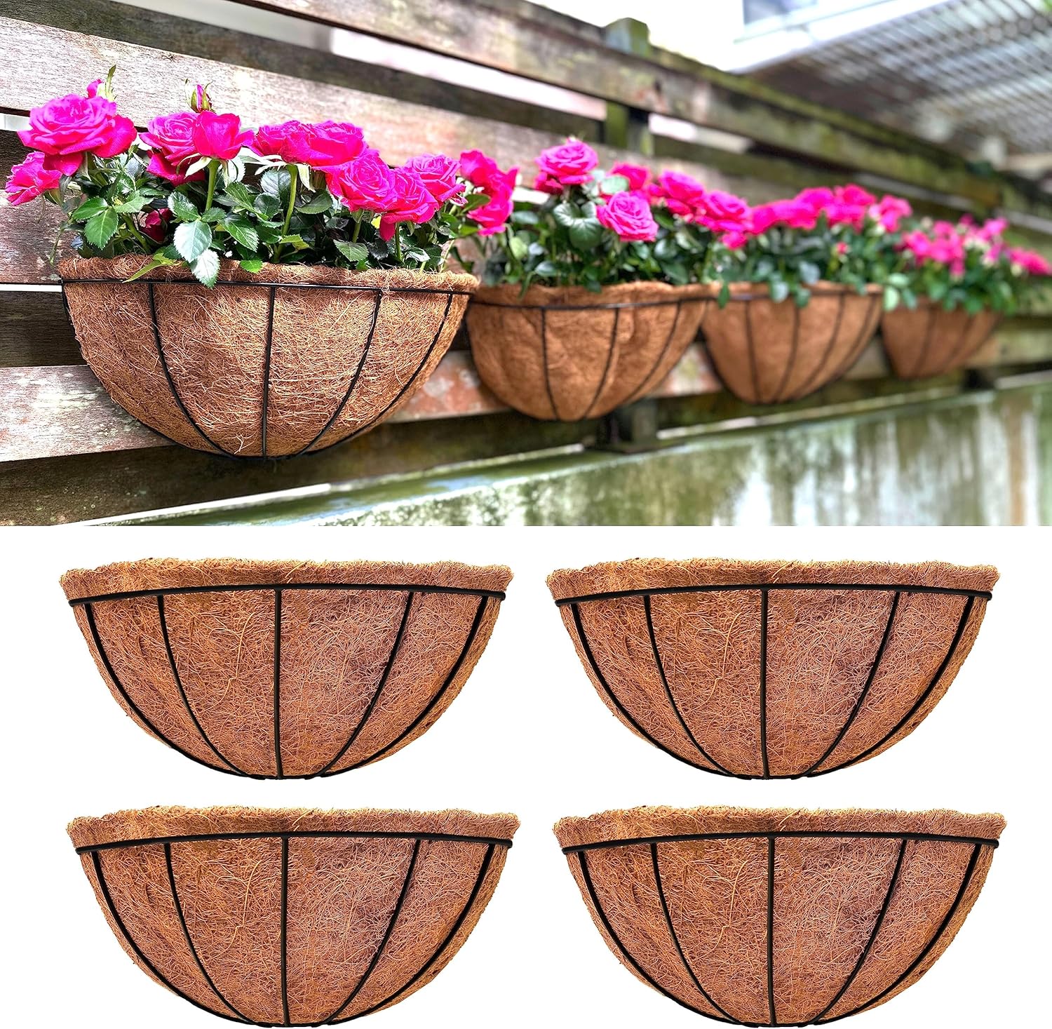 LaLaGreen Wall Planter Outdoor, 4 Pack, 14 Inch Large Wall Hanging Flower Basket with Coco Liner, Vertical Living Wall Mounted Wire Pot Outside Fence Railing Plant Pots Holder Deck Porch Balcony Patio