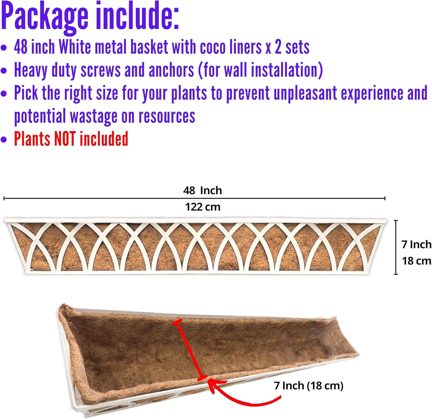 LaLaGreen Wall Planter Outdoor (48 inch, 2 Pack) White Metal Rectangular Hanging Flower Box Planters with Coco Liner Window Boxes Basket Plant Holder Horse Trough Deck Rail Railing Patio Porch Balcony