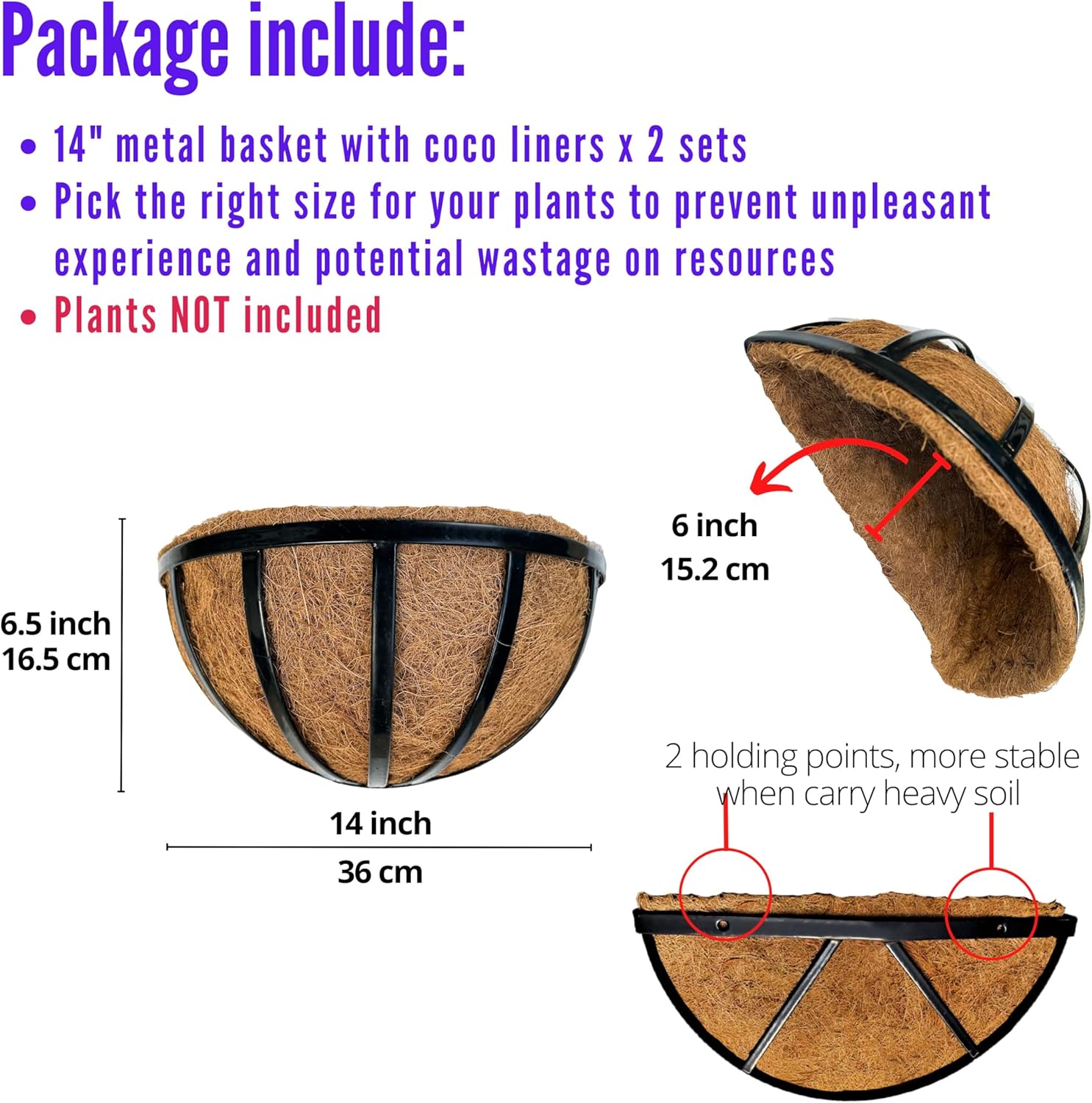 - FLAT IRON FRAME WITH COCO LINER: 2 Pack set, 14 inch, pick the right size for your plant to prevent unpleasant experience and potential wastage on resources. Flowers and Plants are NOT included. Easy to use, no special assembly is required