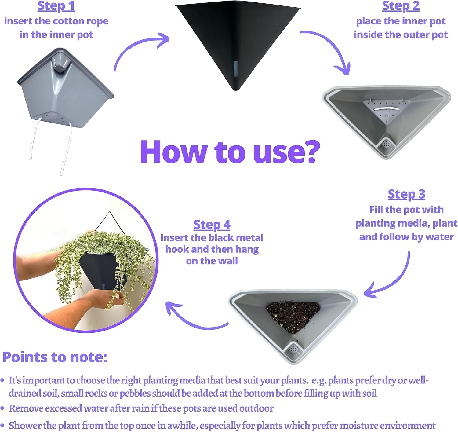 - HASSLE-FREE WALL GARDEN: Create an indoor plant wall with these wall hanging planters is effortless. It works not only with the normal house plants, but also plants prefer dry, well drained soil, such as succulent and cactus. Just add small rocks/pebbles at the bottom before soil or simply go without inserting the wicks. The huge outer pot can catch more excessed water than normal pot saucer and keep your place clean and dry. Get multiple sets to create your own unique living plant wall today