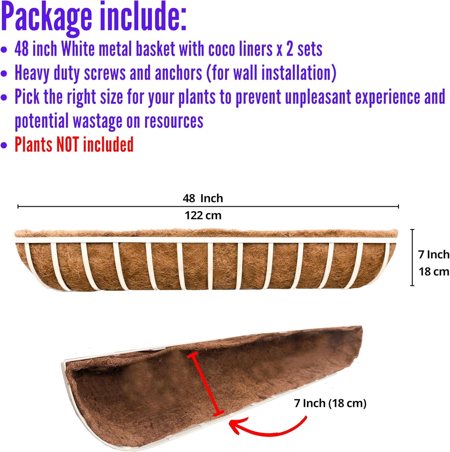LaLaGreen Window Planter Boxes (48 Inch, 2 Pack) Deck Railing Flower Box with Coco Liner, White Metal Rectangular Wall Planters for Outdoor Plants Fence Balcony Horse Trough Garden Herb Patio Porch