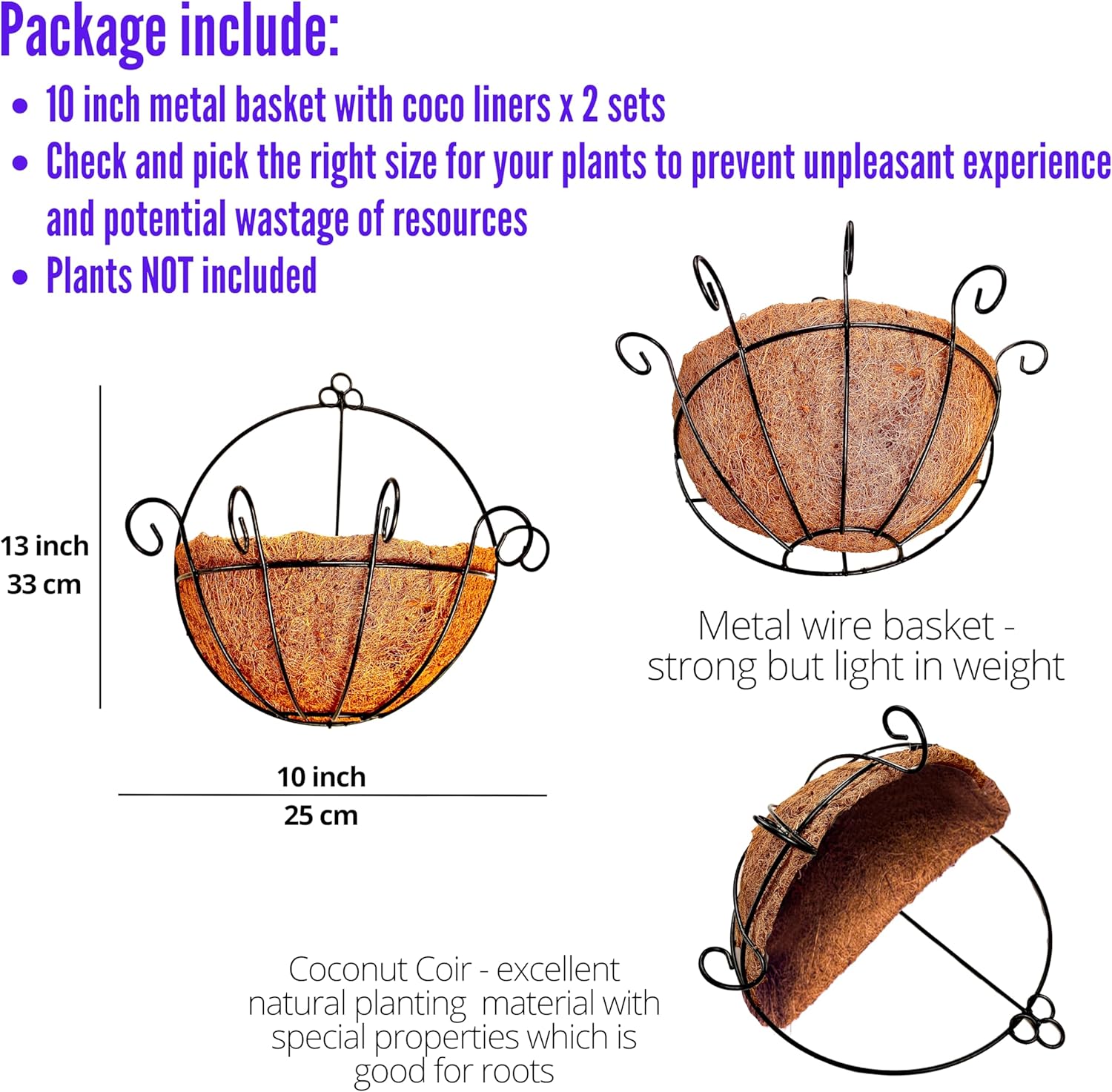 Shoplala Wall Hanging Planter for Outdoor (2 Pack, 10 Inch) Black Metal Hanging Flower Basket for Plants, Wall Planters with Coco Liner Indoor Wall Mounted Plant Holder Outside Balcony Fence Rail Deck